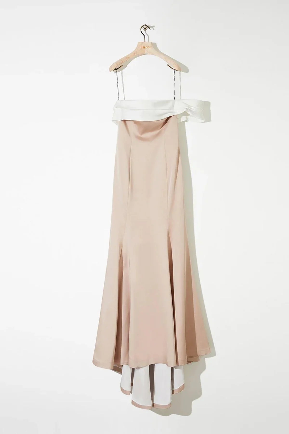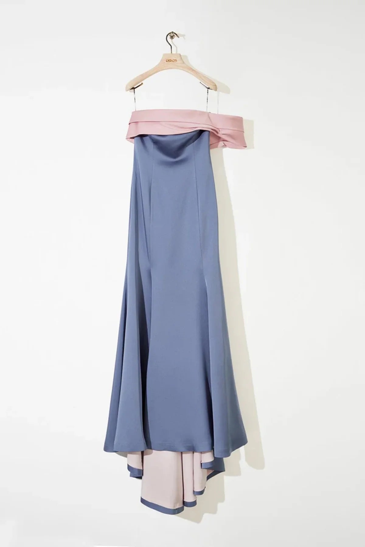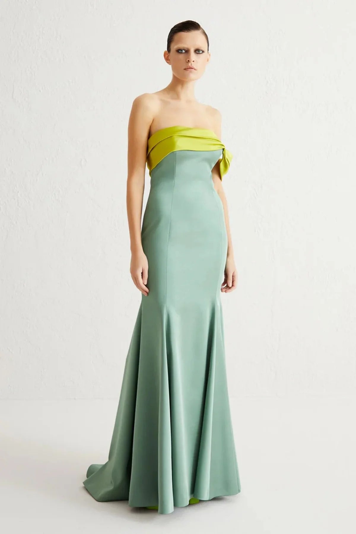 - Kontrast renk garnili, straplezi asimetrik, küçük tek kol detaylı, göğüs kupları glop destekli, kontrast renk astarlı, yanı gizli fermuarlı, kuyruklu, uzun, saten kumaş elbise.