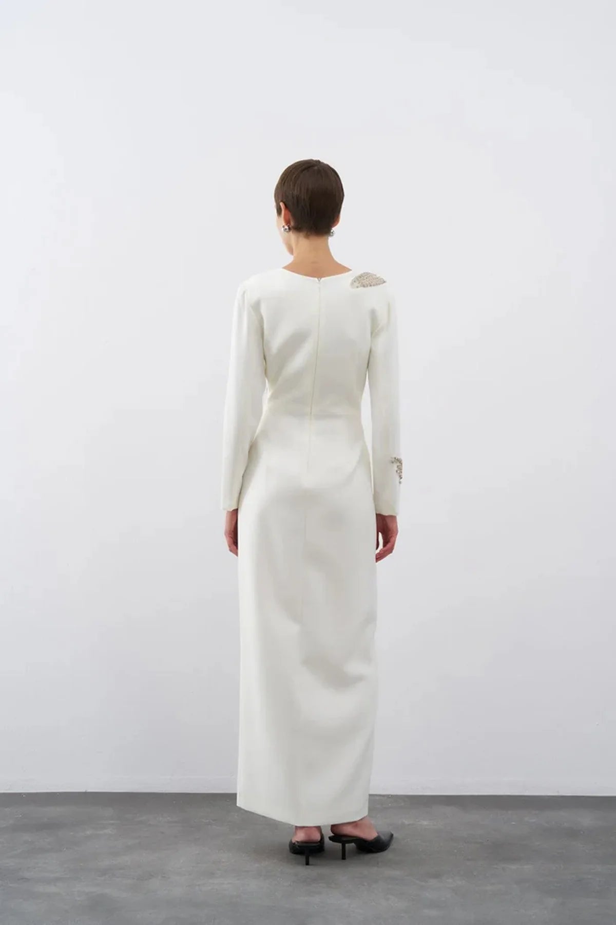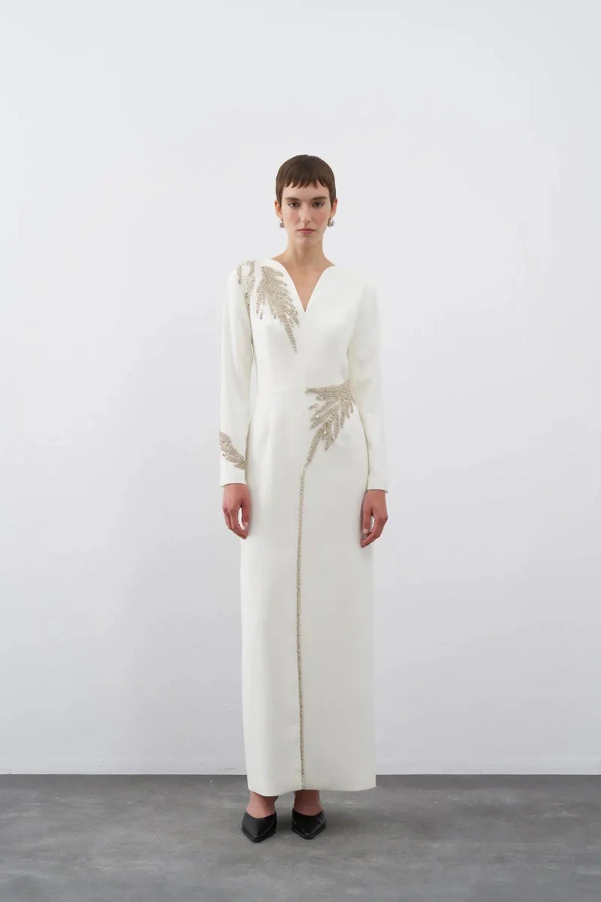 TAŞ İŞLEMELİ V YAKA ÖNDEN YIRTMAÇLI UZUN ABİYE ELBİSE2262