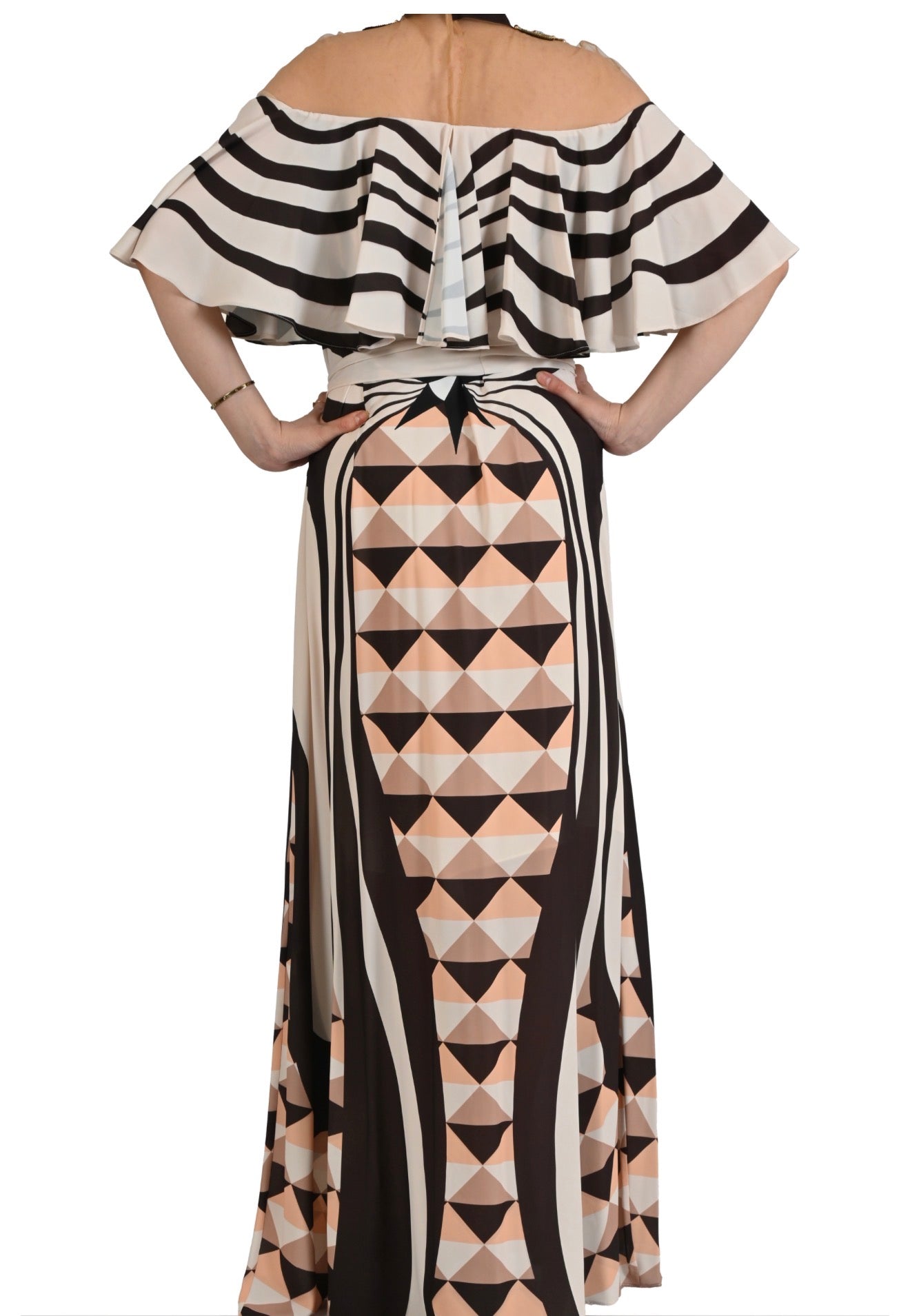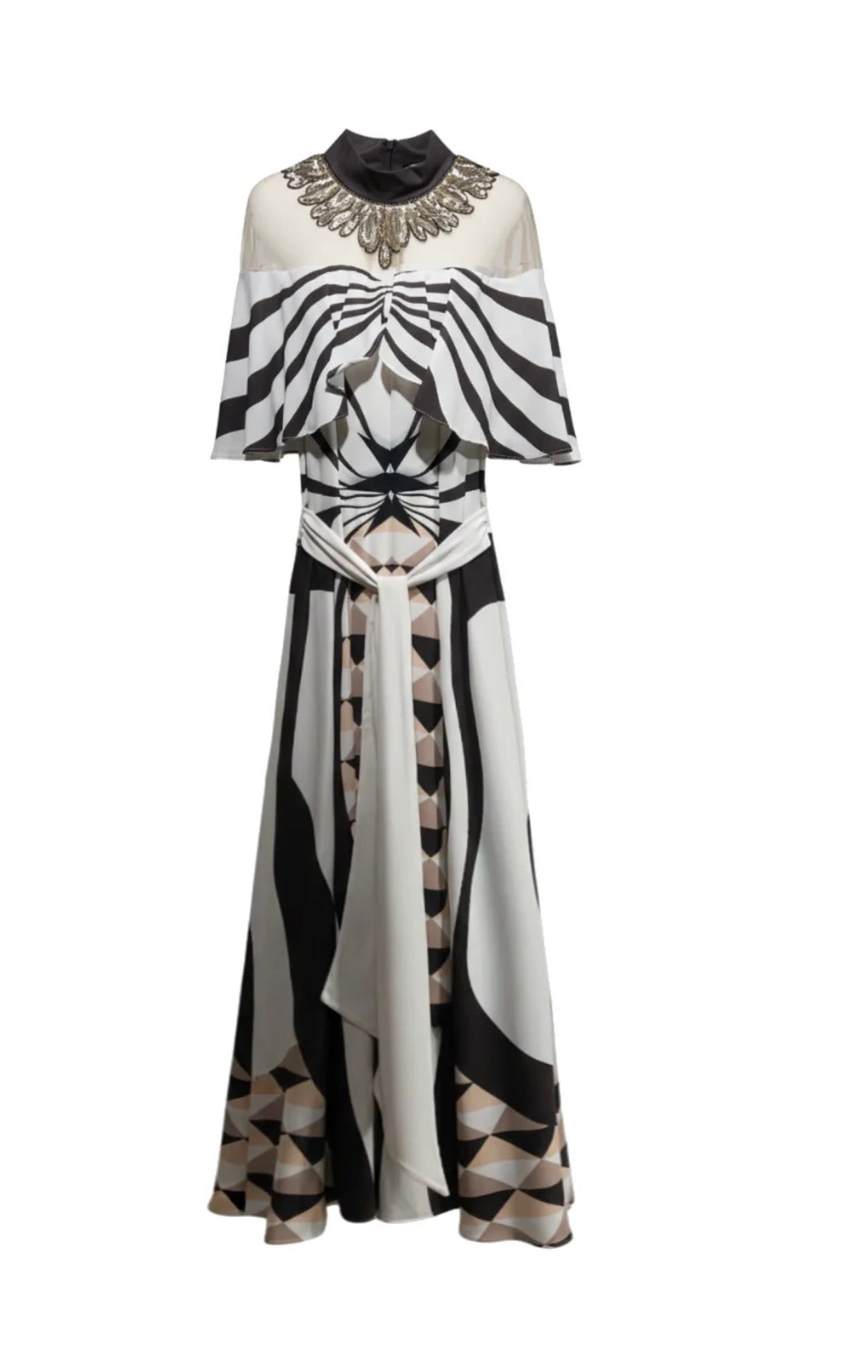 ANTİK ALTIN YAKA DETAYLI GEOMETRİK DESENLİ ABİYE ELBİSE