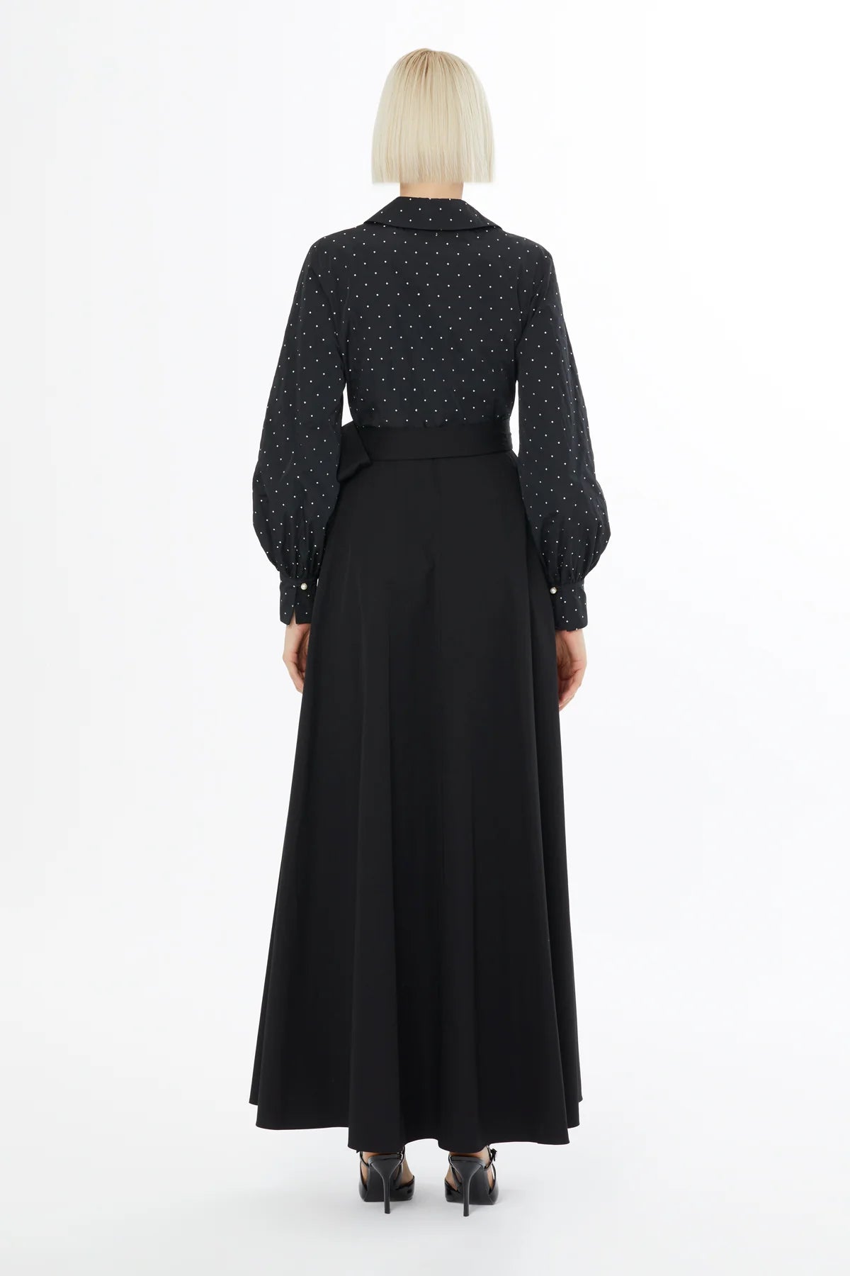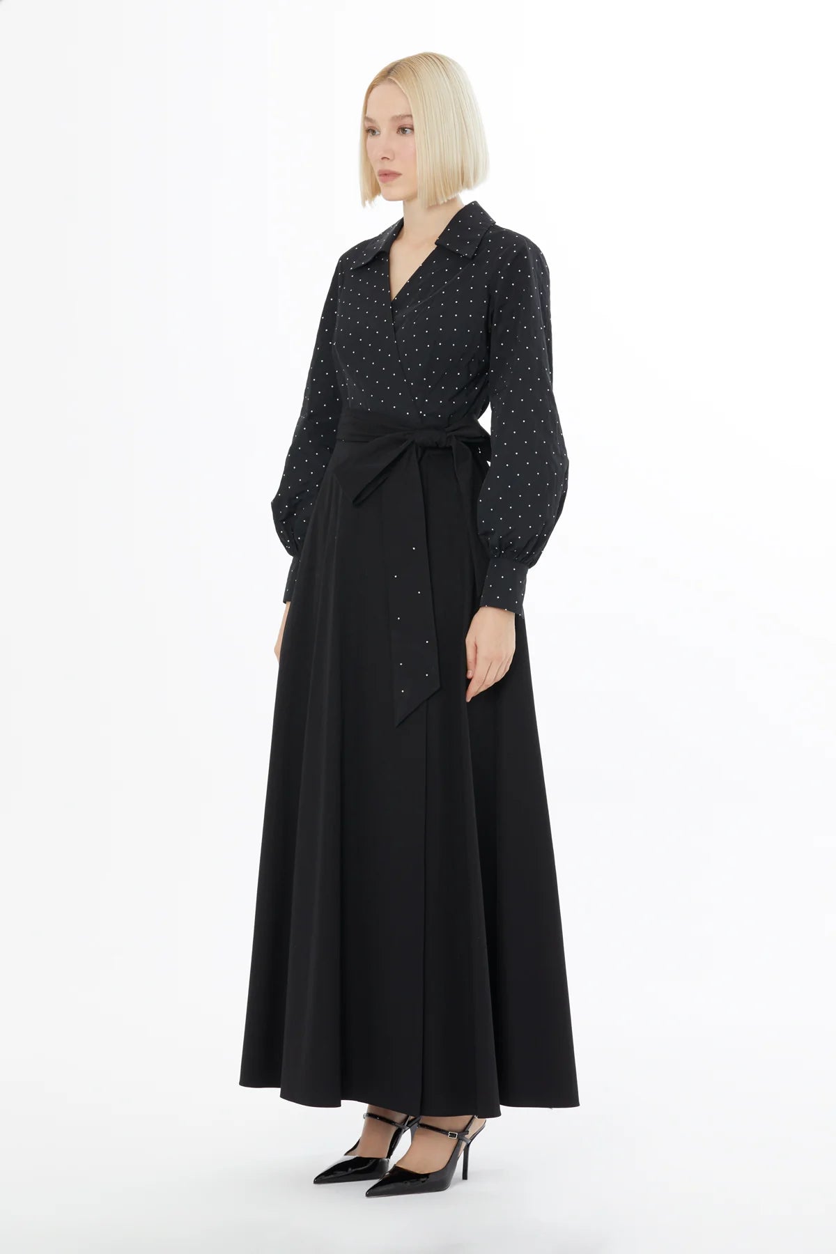 Balon Kollu Bağlamalı Puantiye Uzun Elbise