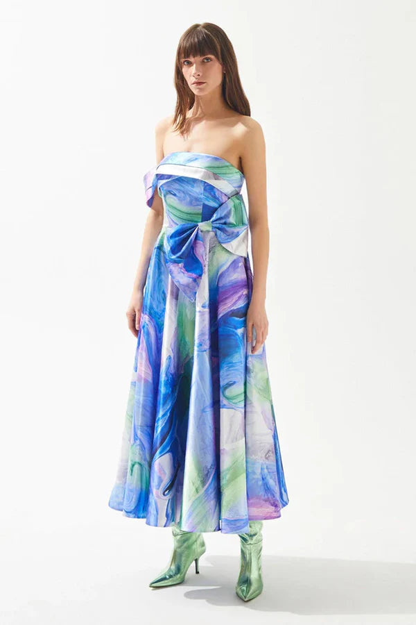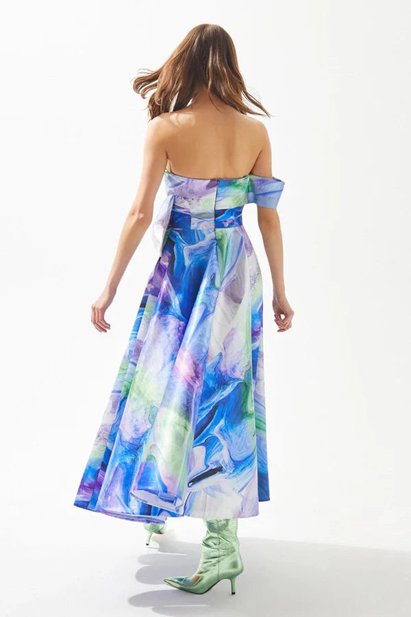 DESENLİ FİYONK DETAYLI TEK DÜŞÜK KOLLU UZUN ELBİSE
