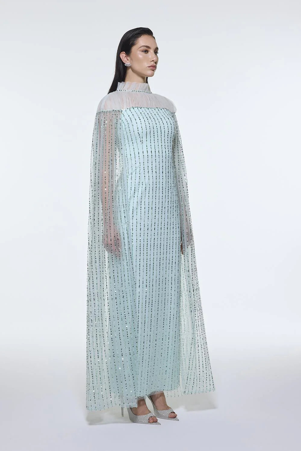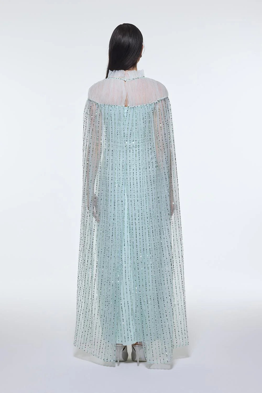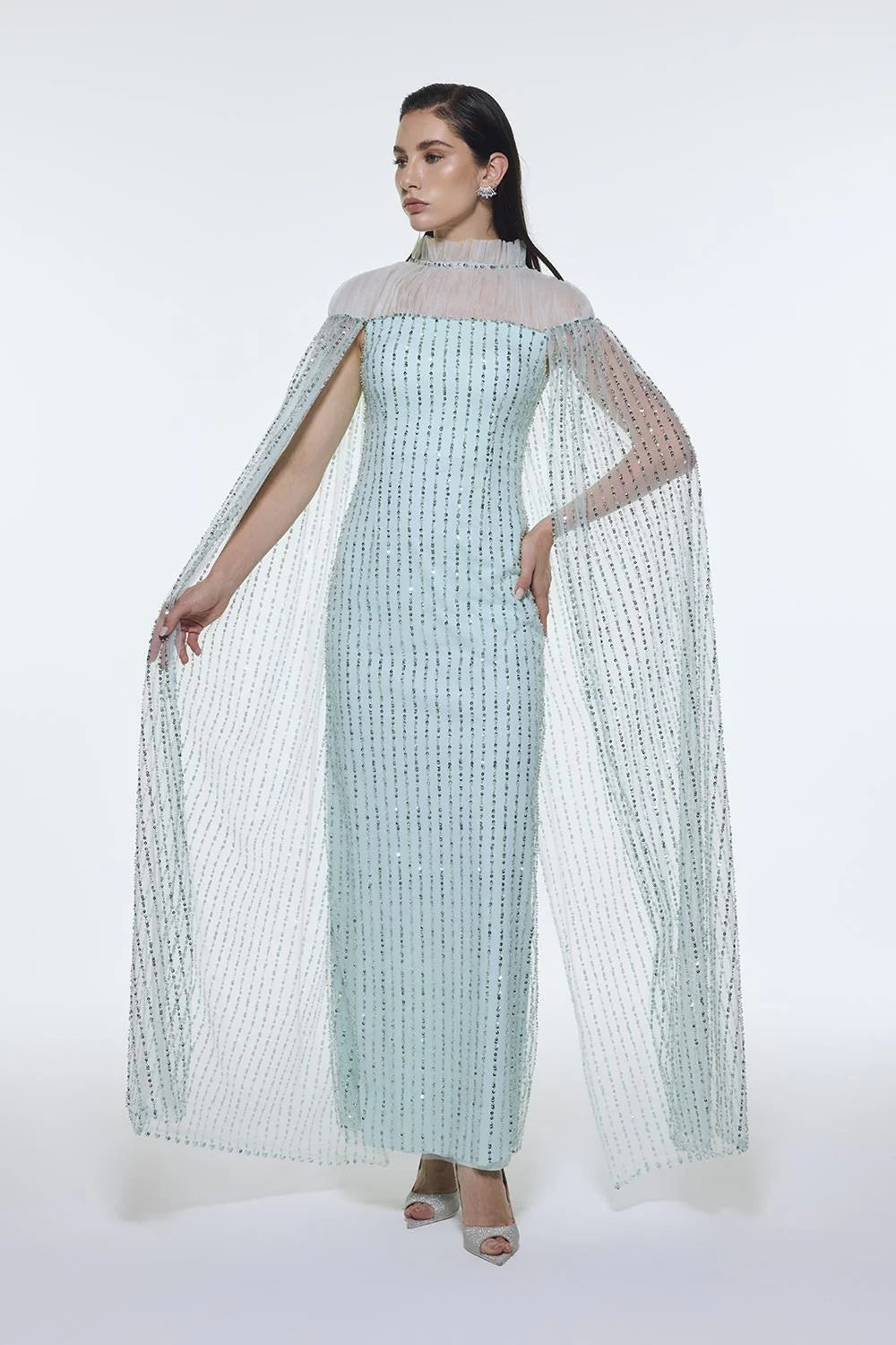 DİK YAKA TAŞ İŞLEMELİ TÜL UZUN ABİYE ELBİSE - 9400C