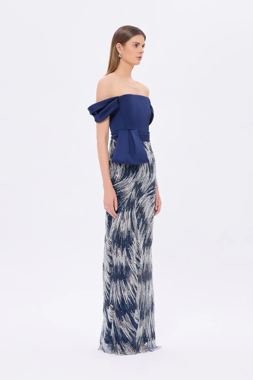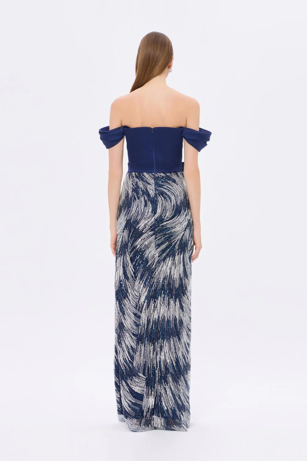 DÜŞÜK OMUZ YIRTMAÇ DETAYLI UZUN ABİYE ELBİSE - 9308C