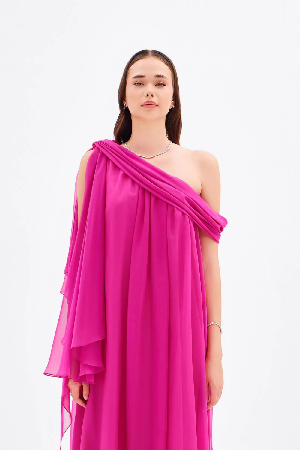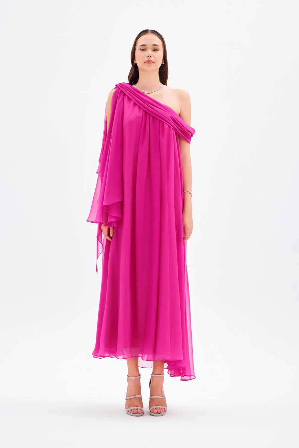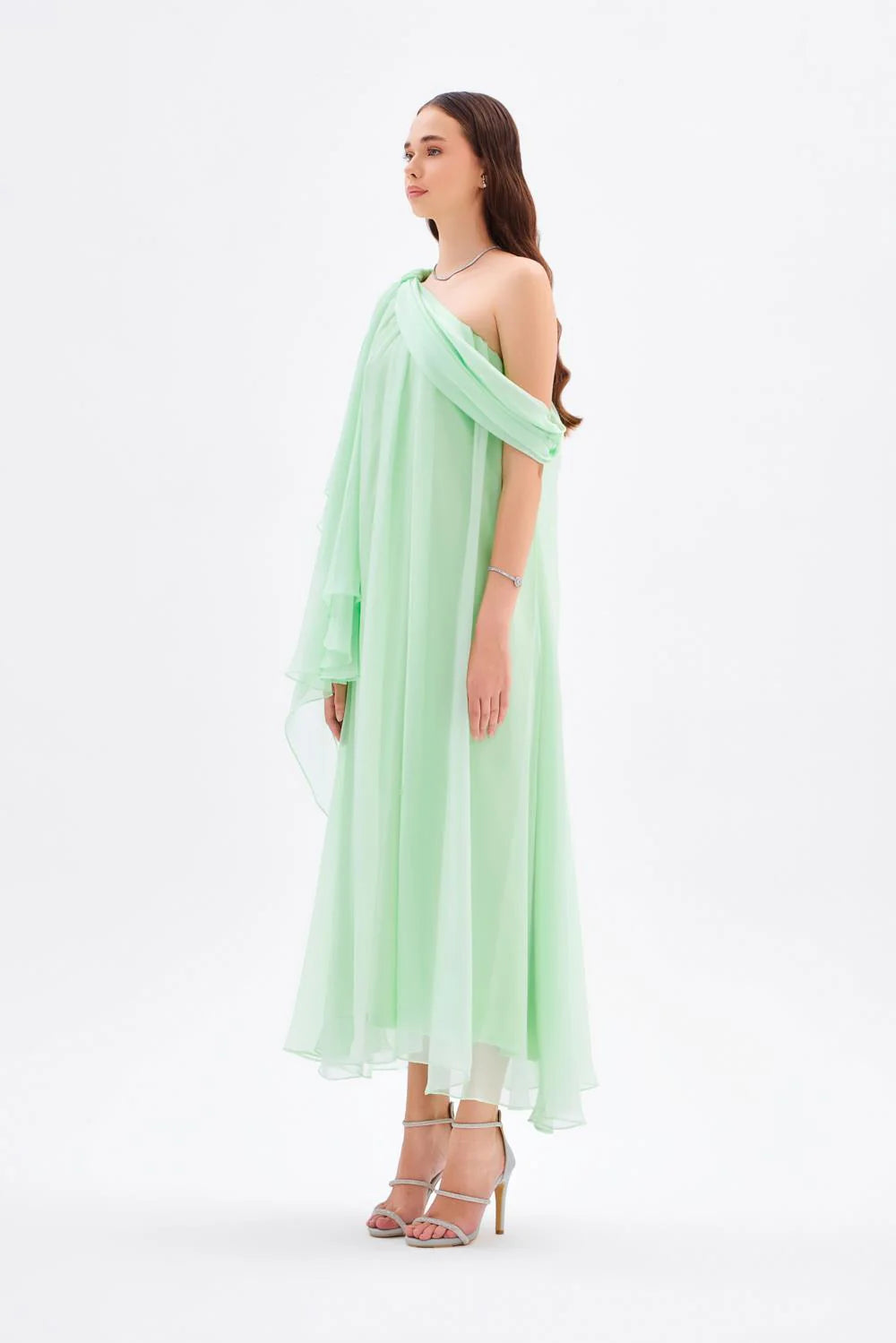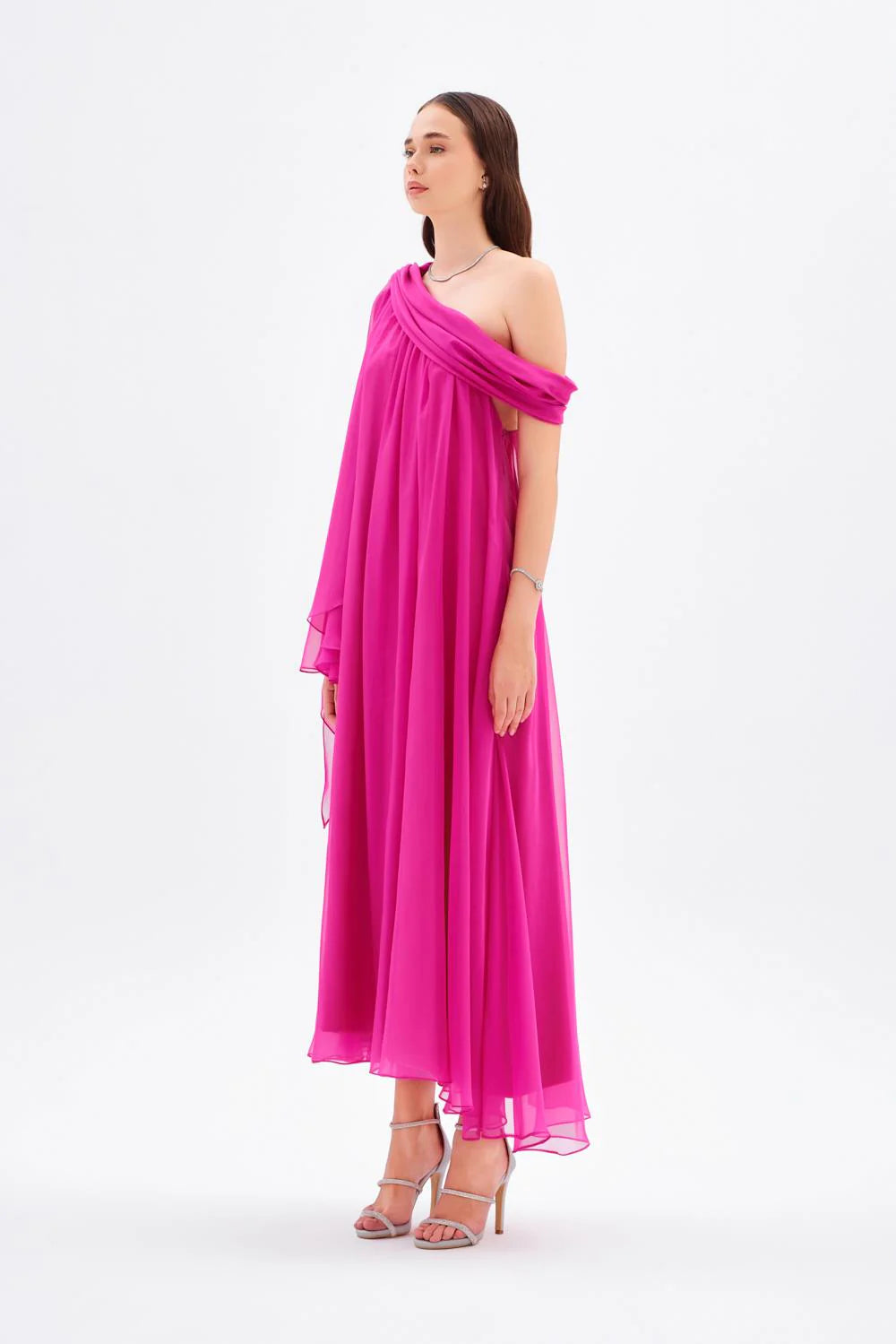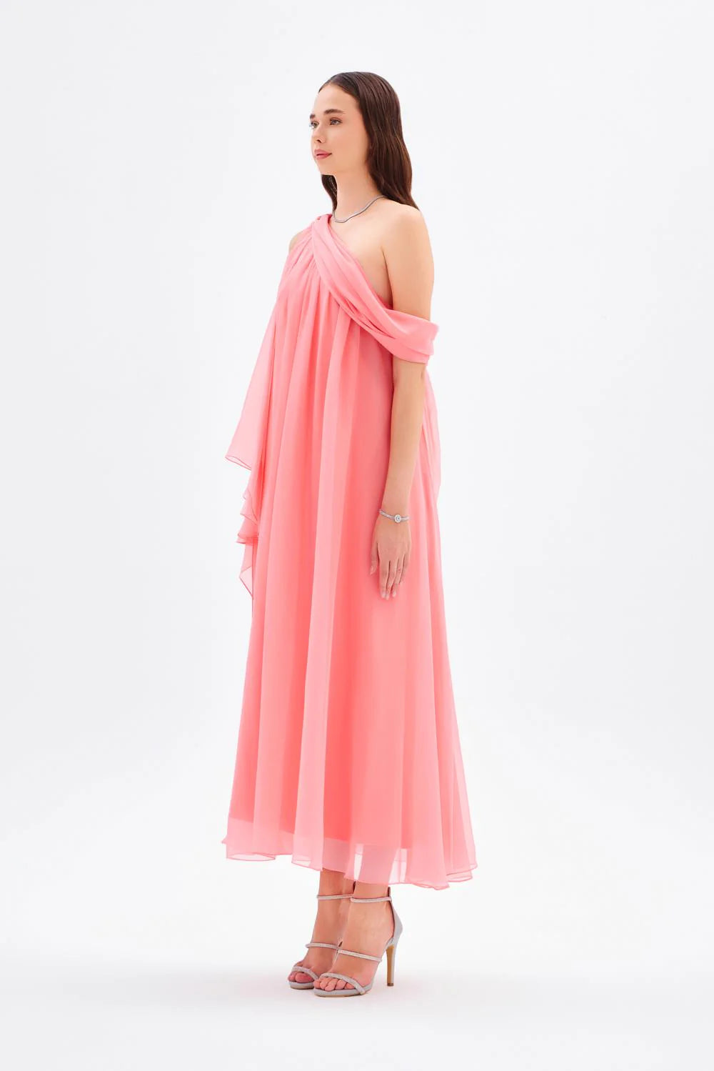 DÜŞÜK OMUZLU ŞİFON MİDİ ABİYE ELBİSE - 9081C