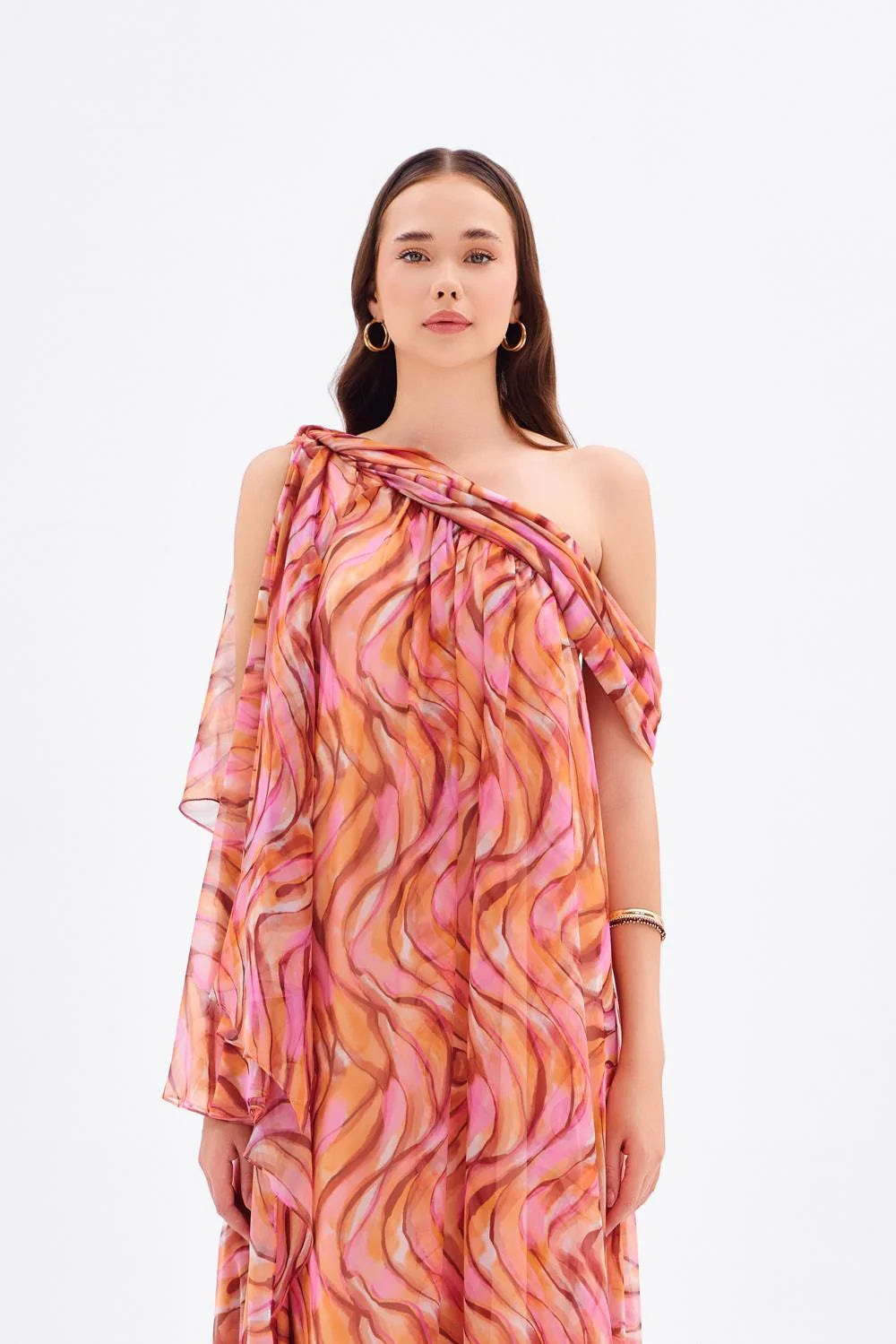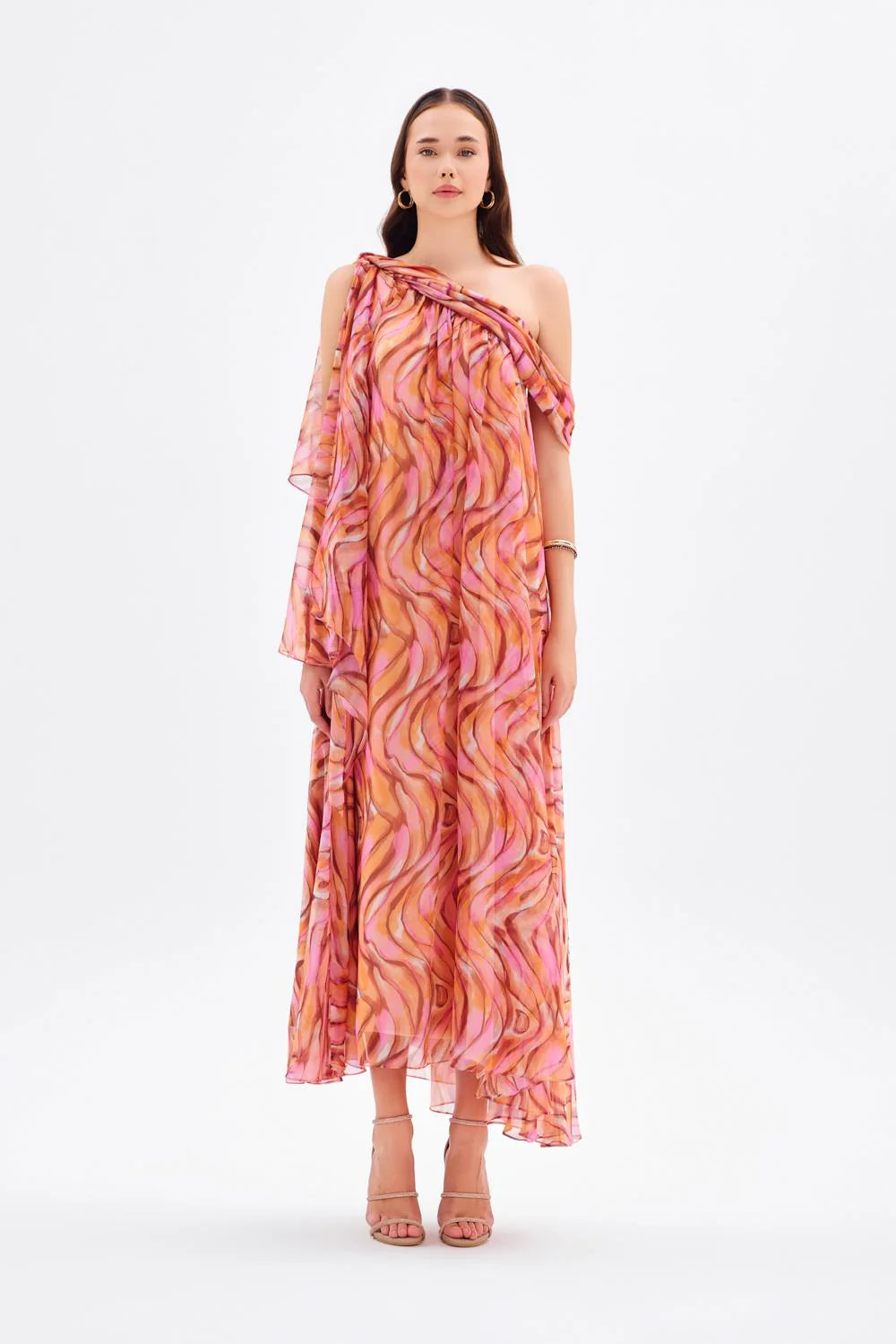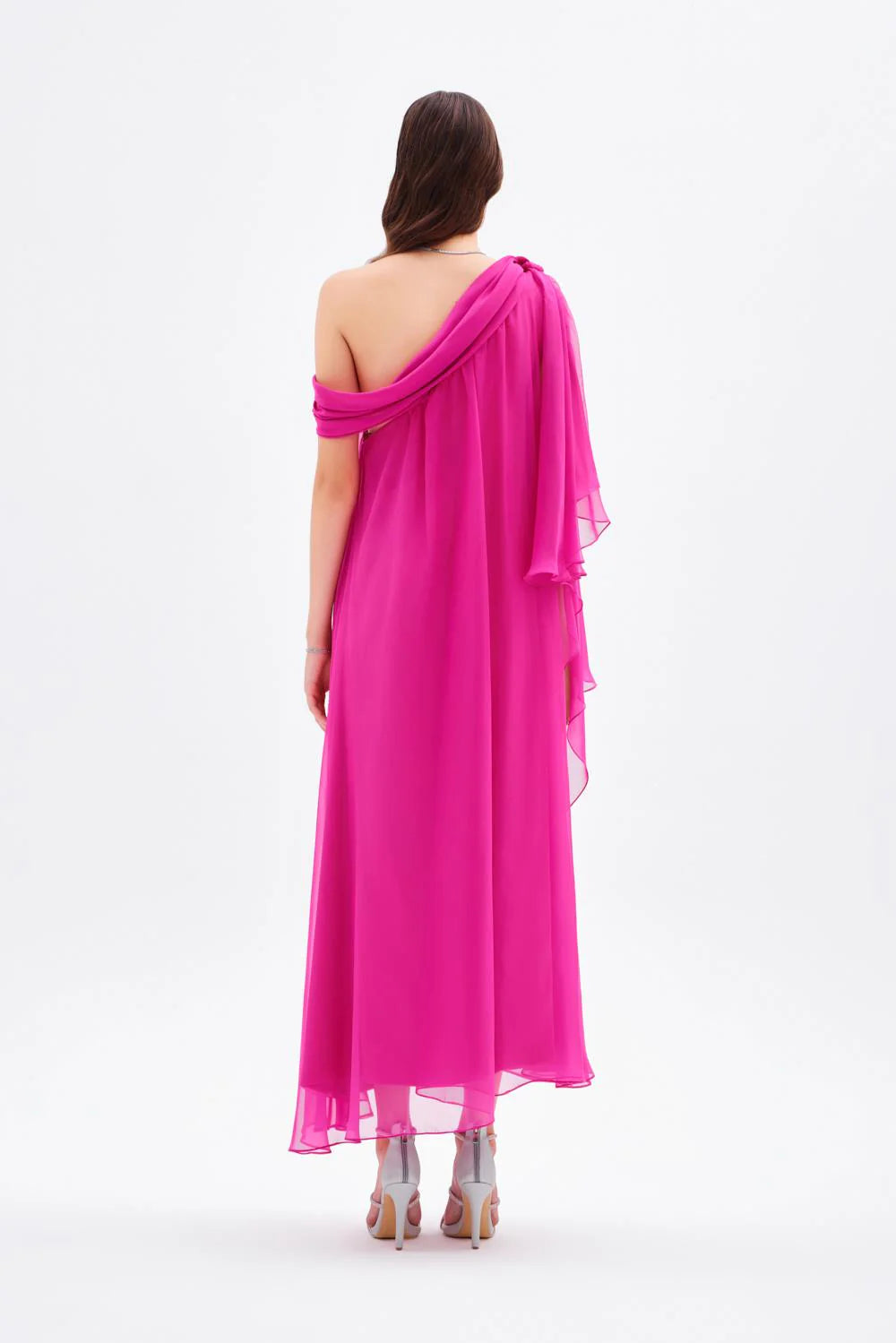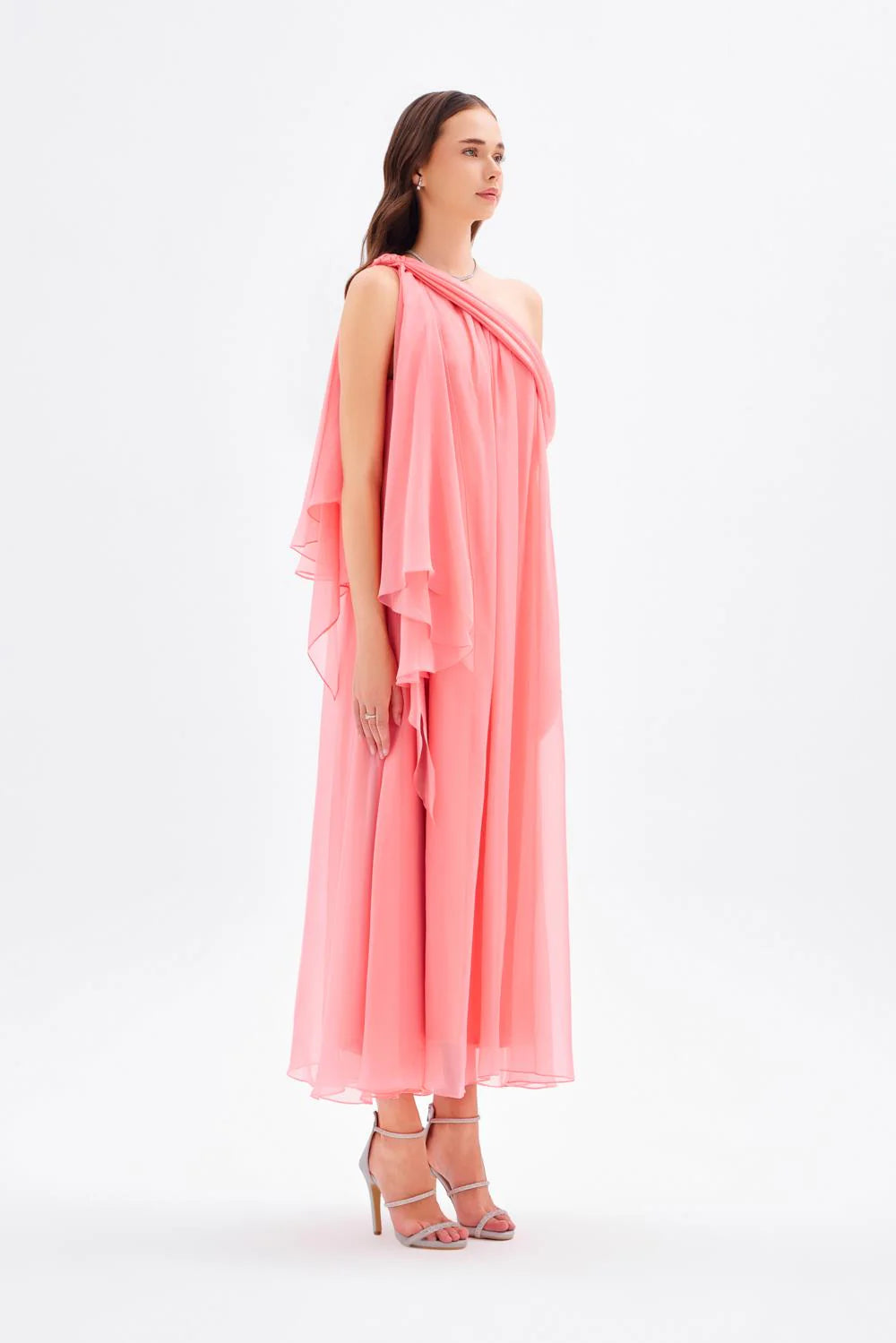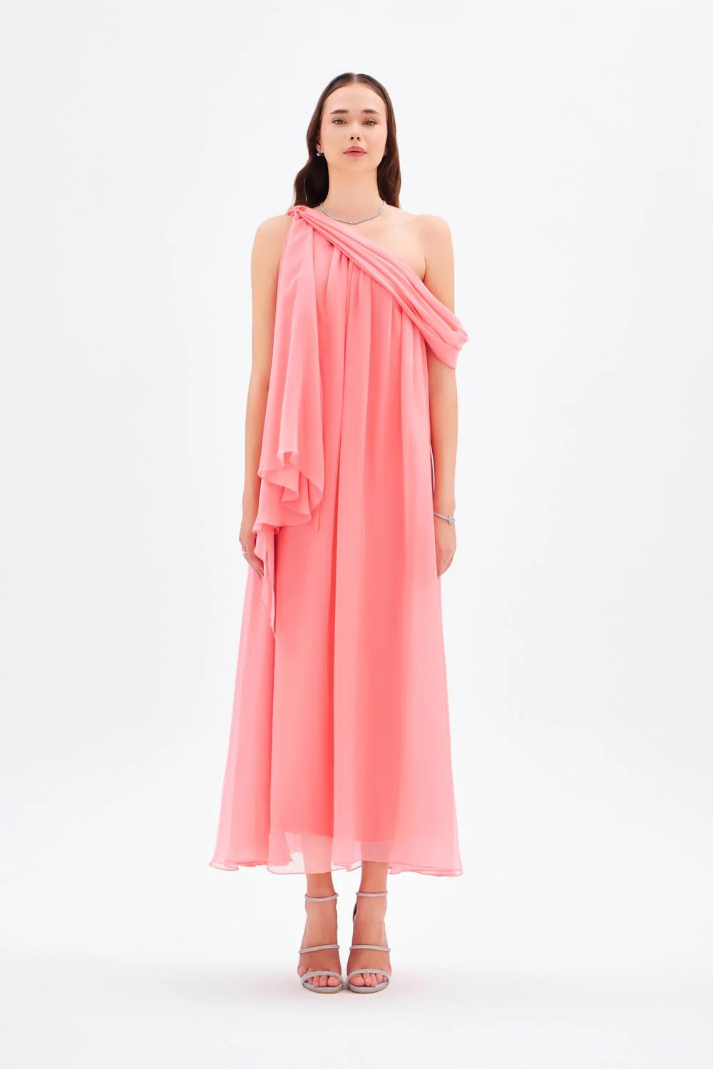 DÜŞÜK OMUZLU ŞİFON MİDİ ABİYE ELBİSE - 9081C
