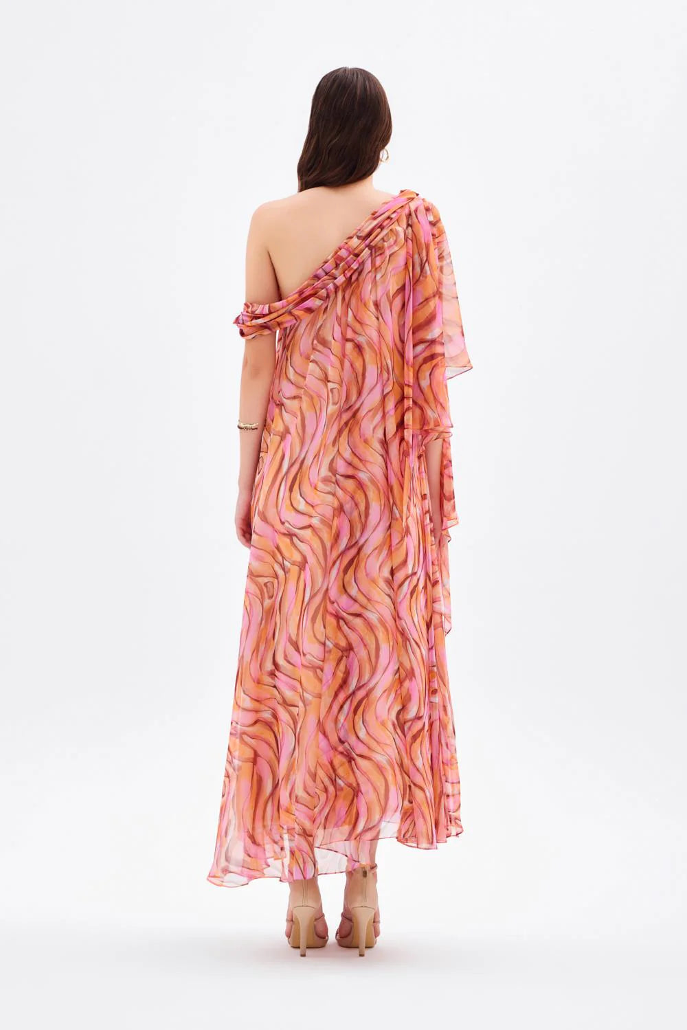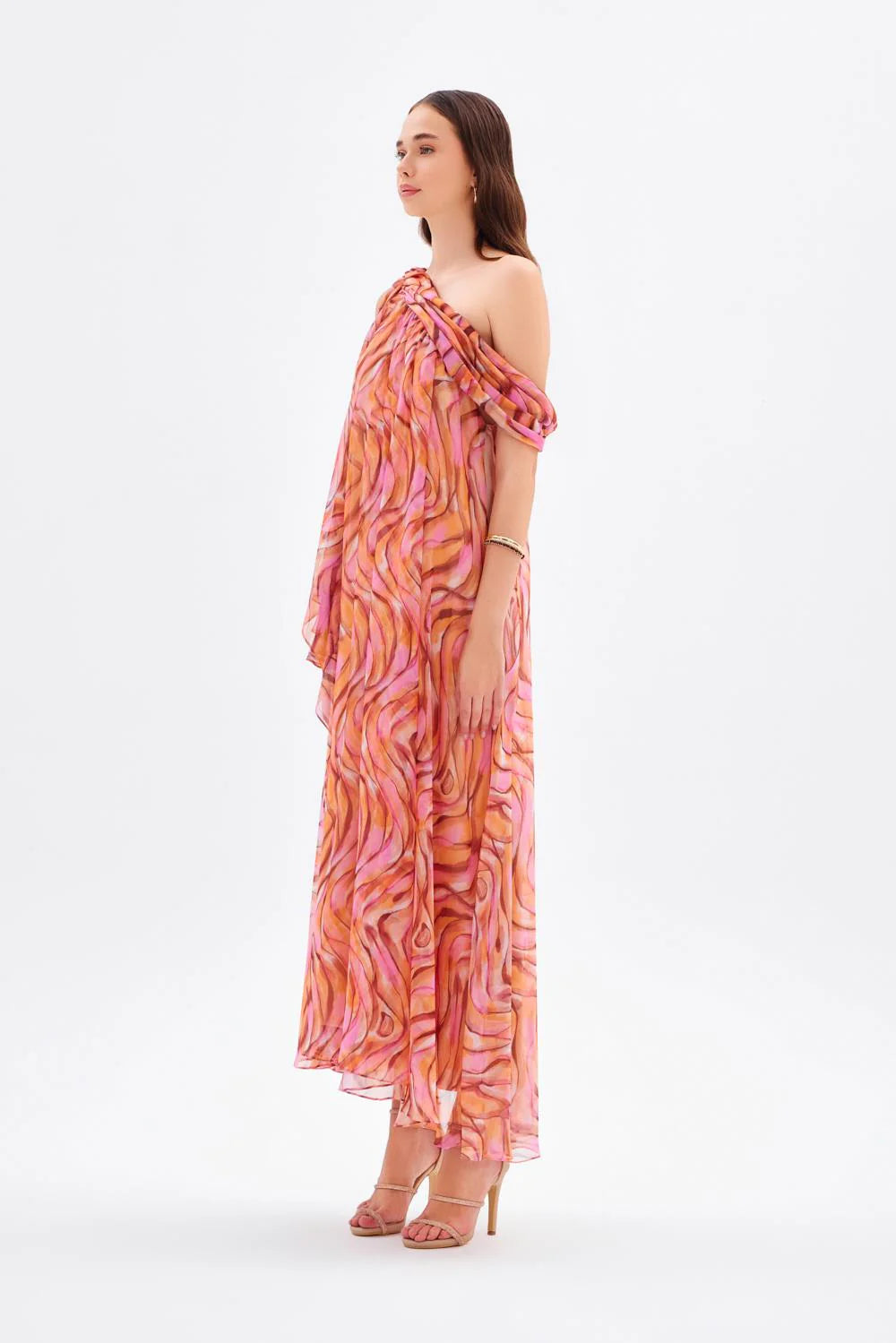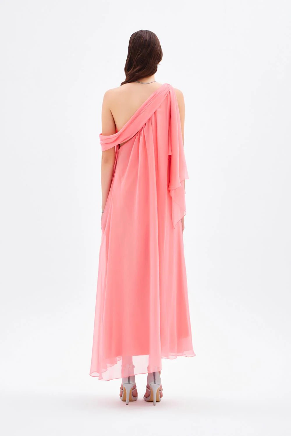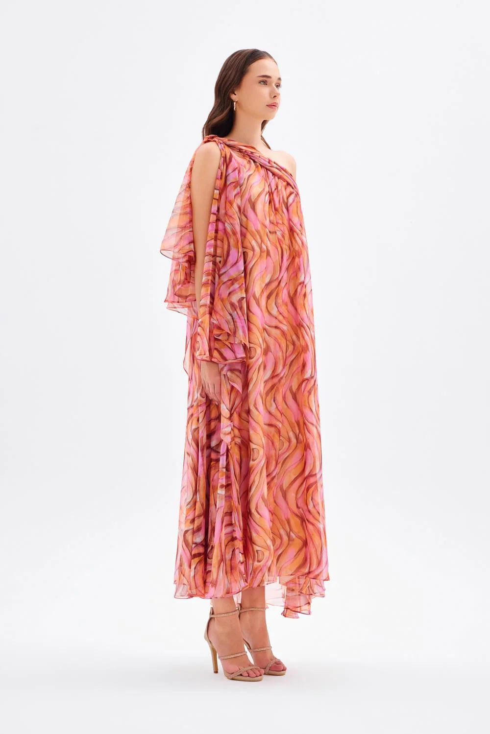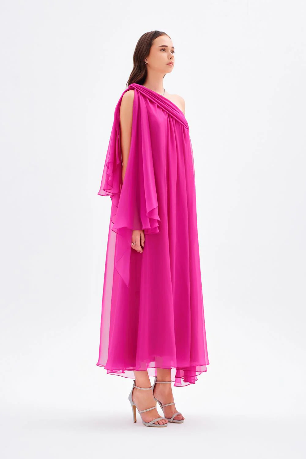 DÜŞÜK OMUZLU ŞİFON MİDİ ABİYE ELBİSE - 9081C