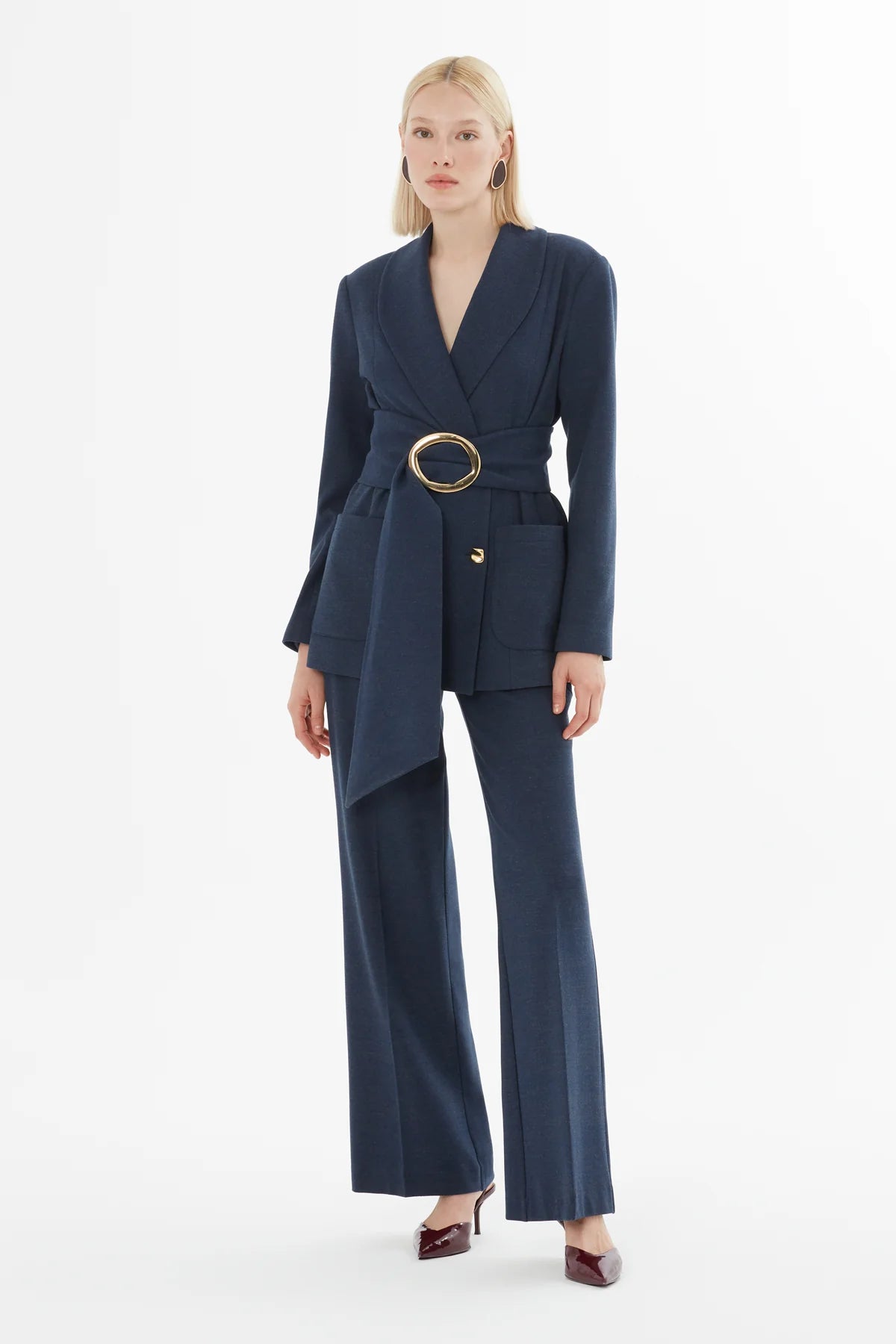 Kruvaze Kapamalı Kemerli Ceket Ve Palazzo Pantolon Takım
