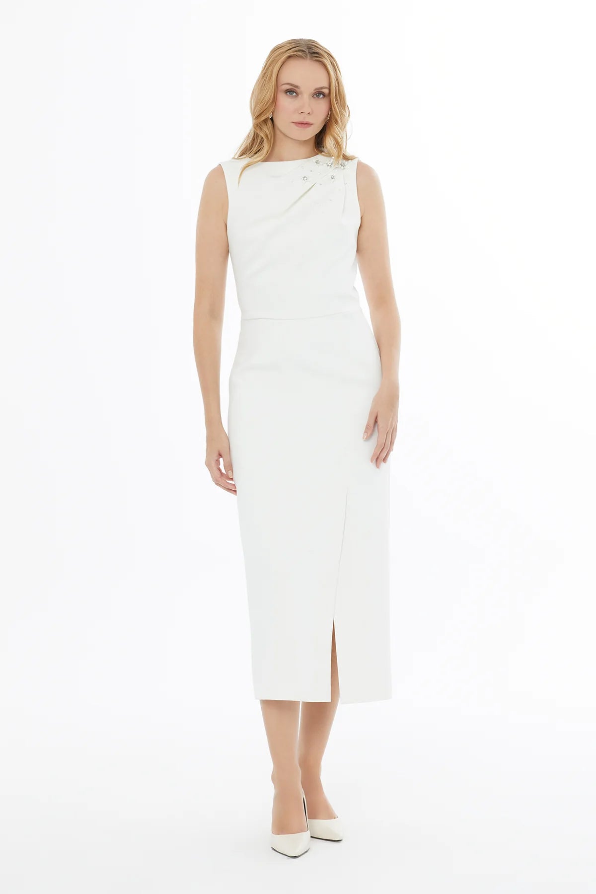 Omuzda Drepe Detaylı Yırtmaçlı Midi Elbise