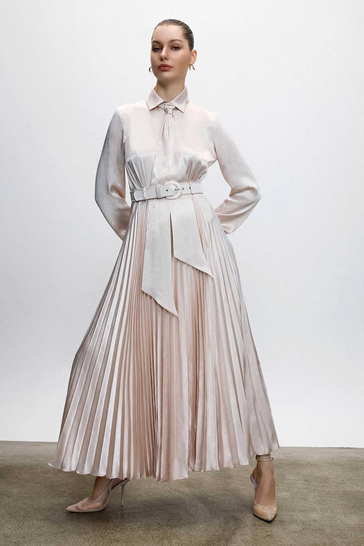 PİLİSE ETEK DETAYLI SATEN KEMERLİ UZUN ELBİSE 2040