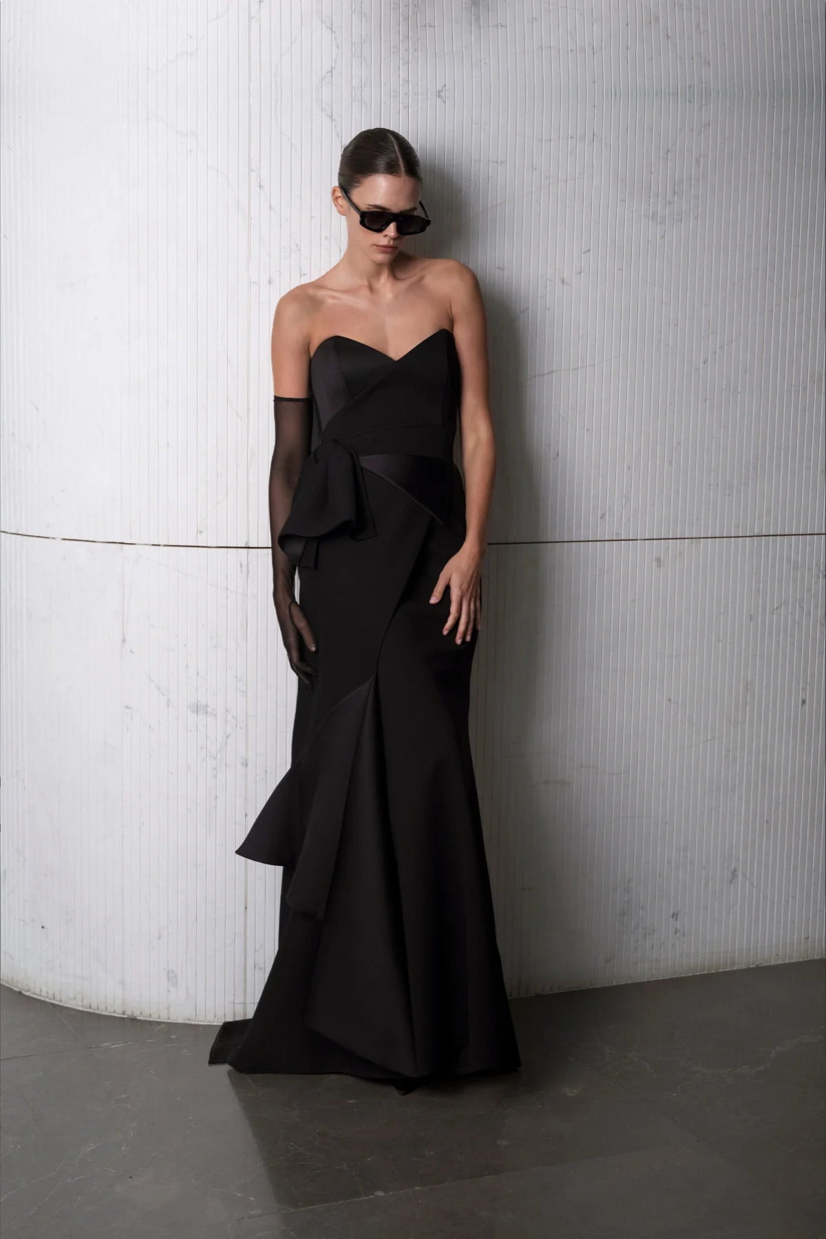 STRAPLEZ FİYONK DETAYLI SATEN UZUN ABİYE ELBİSE