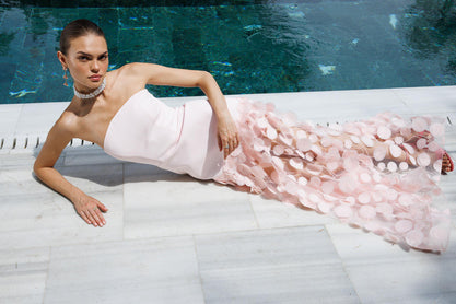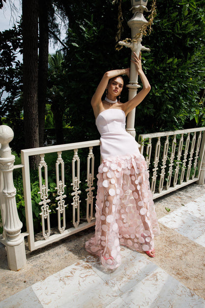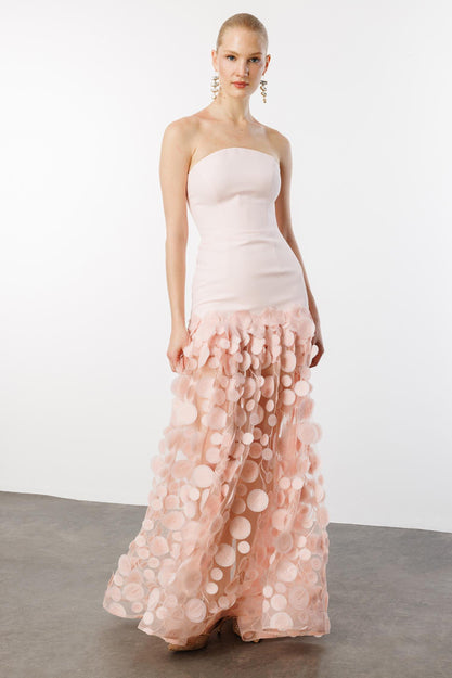 Straplez Üst Krep Eteği 3 Boyutlu Tül Uzun Abiye PEMBE