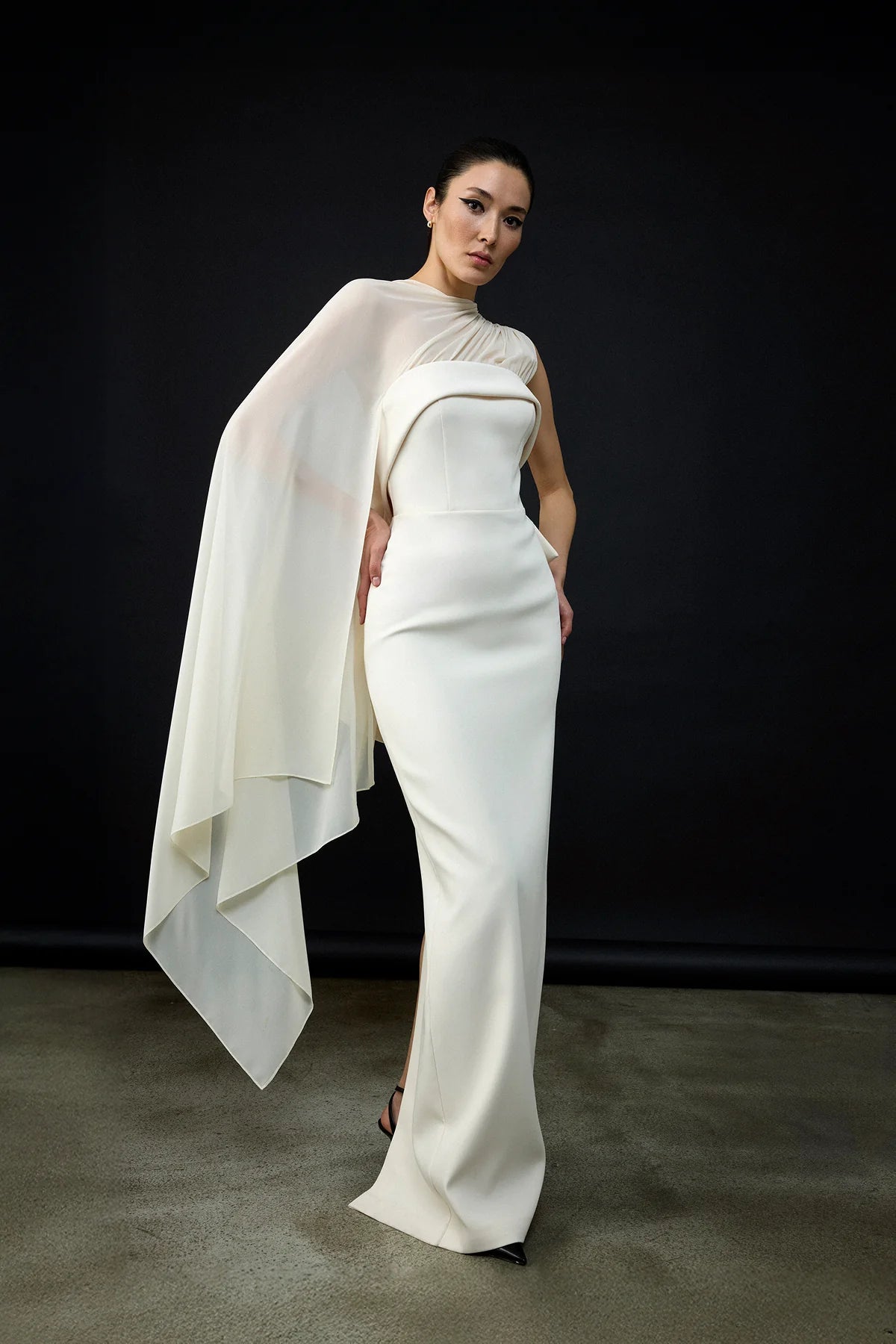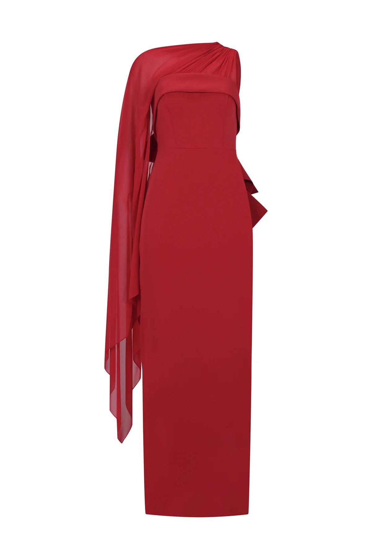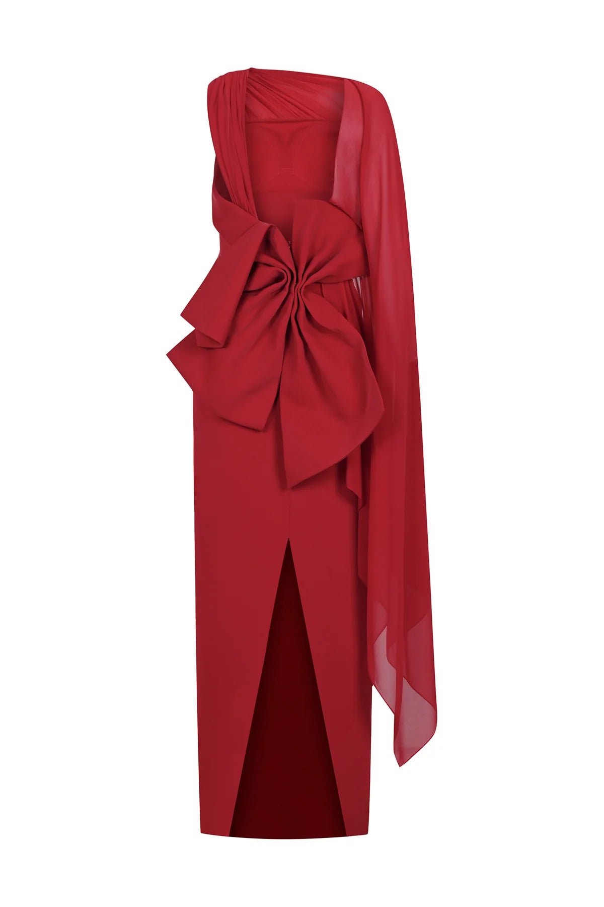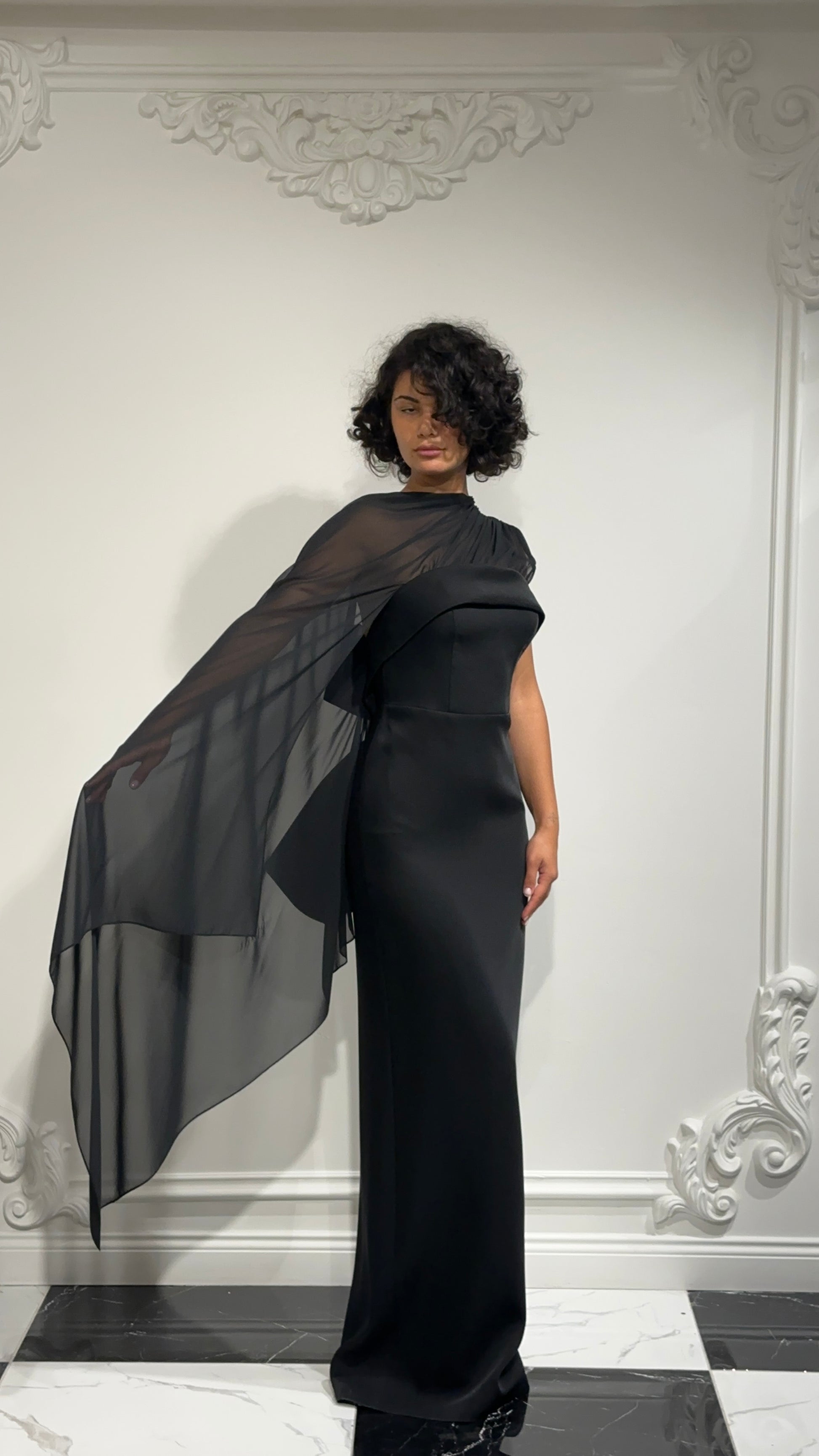 Tül Pelerinli Arka Fiyonk Detaylı Straplez Uzun Abiye ELBİSE 2244