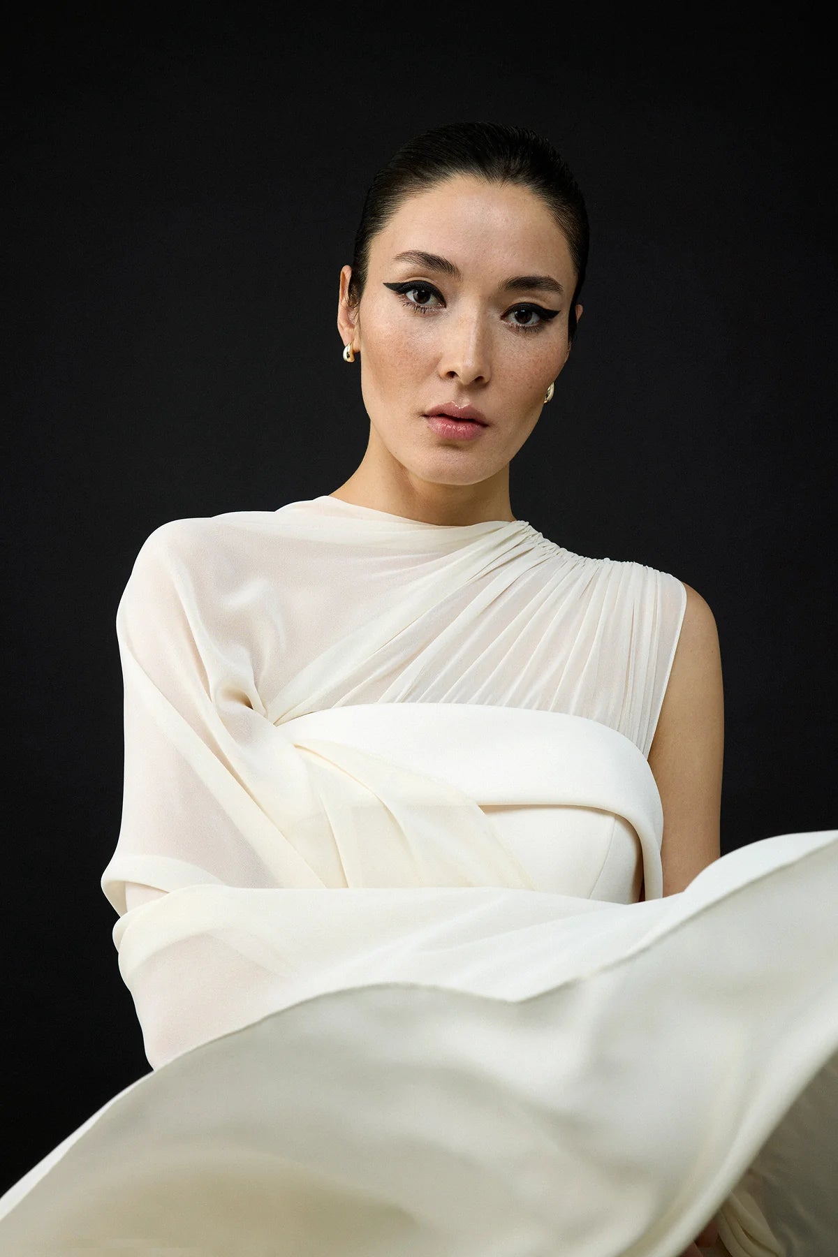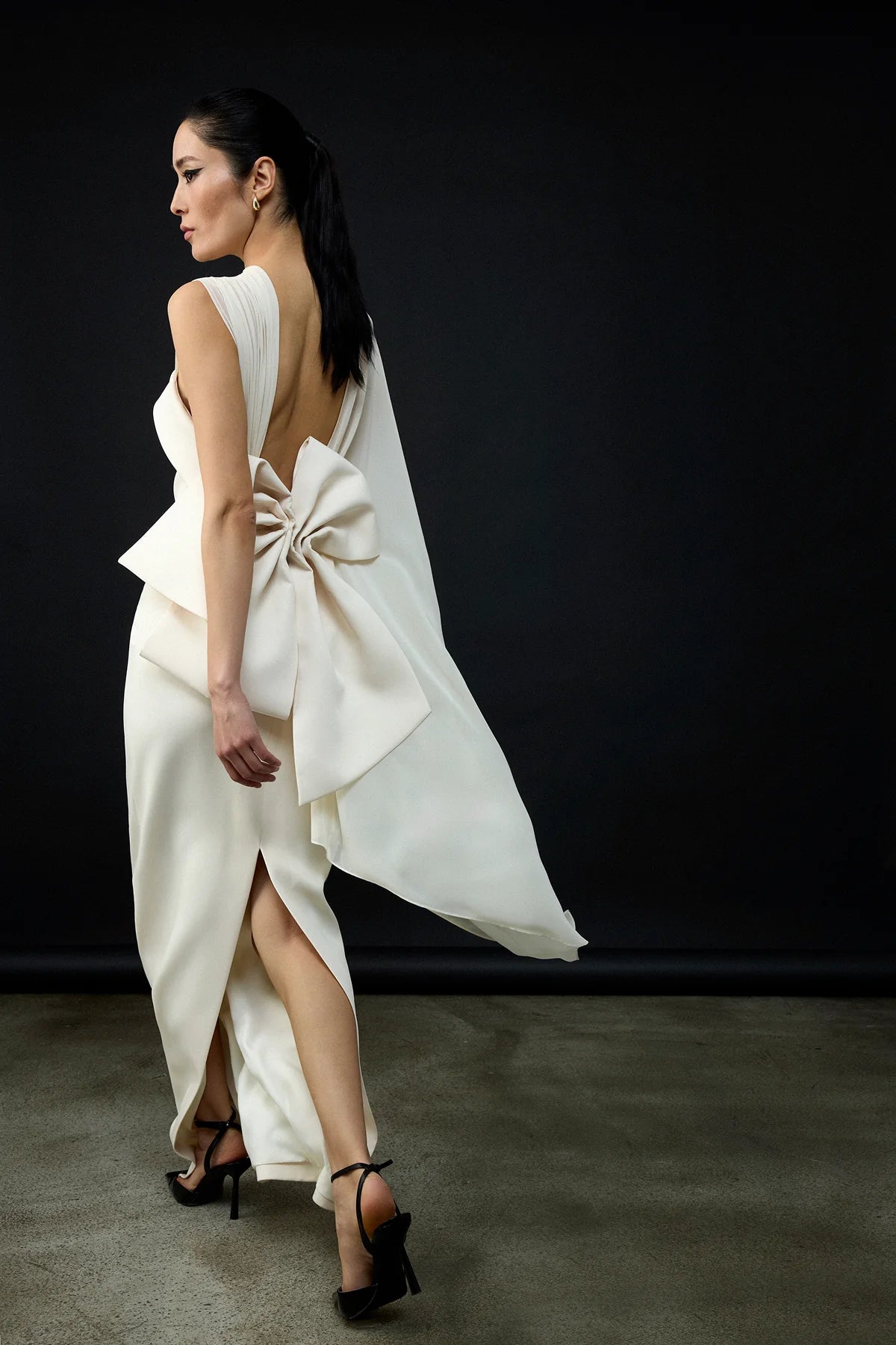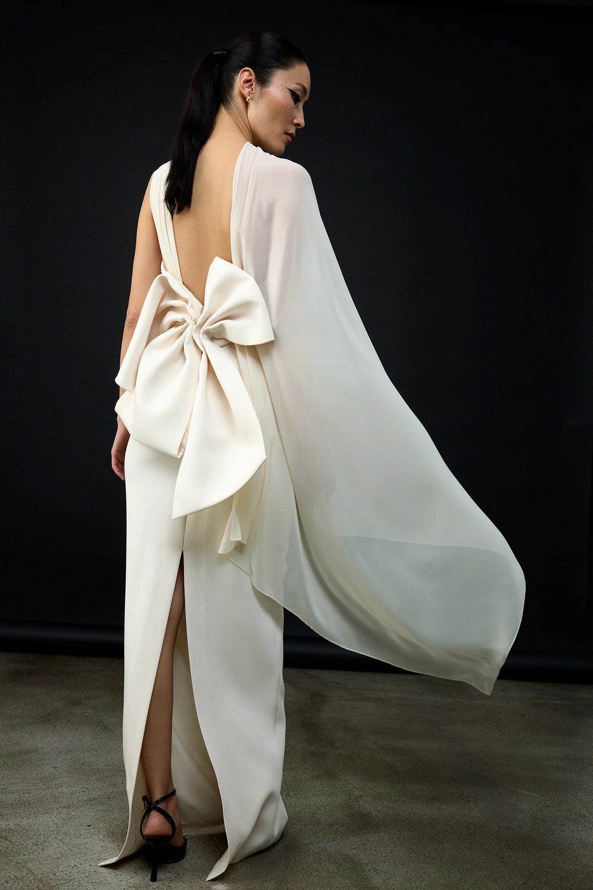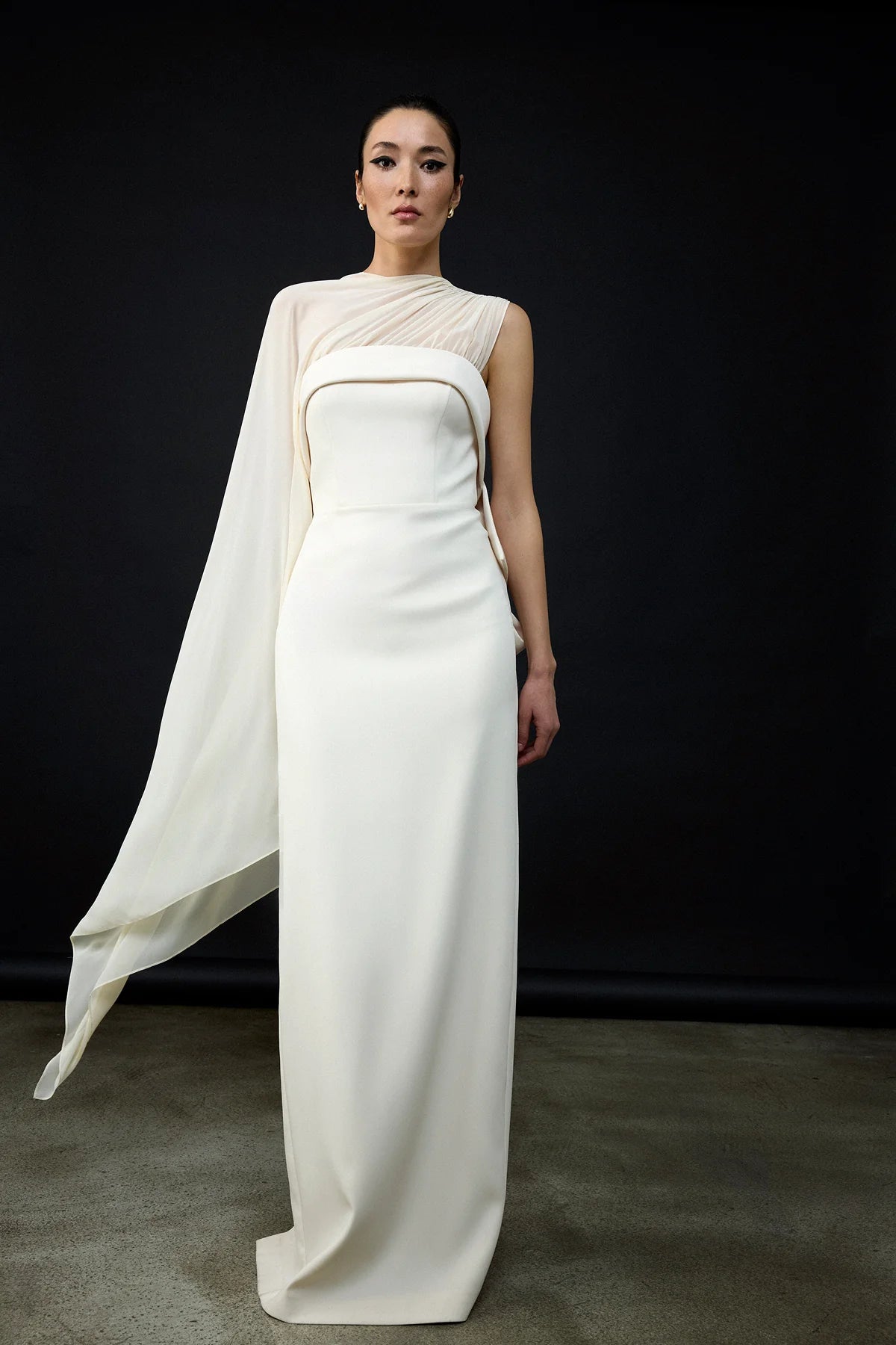 Tül Pelerinli Arka Fiyonk Detaylı Straplez Uzun Abiye ELBİSE 2244