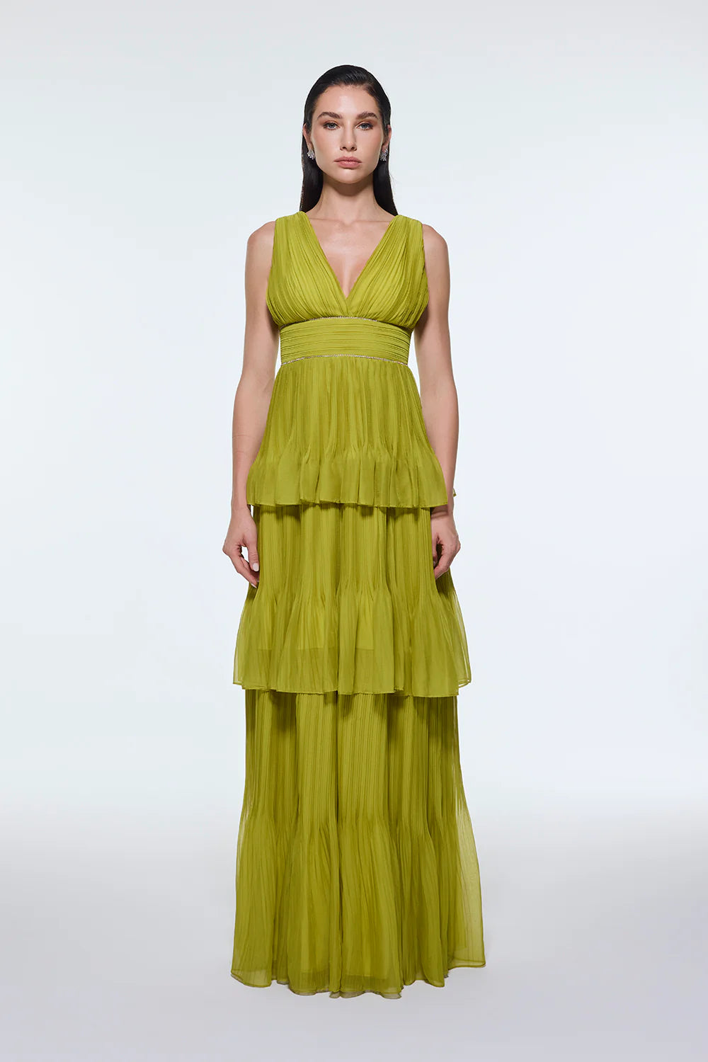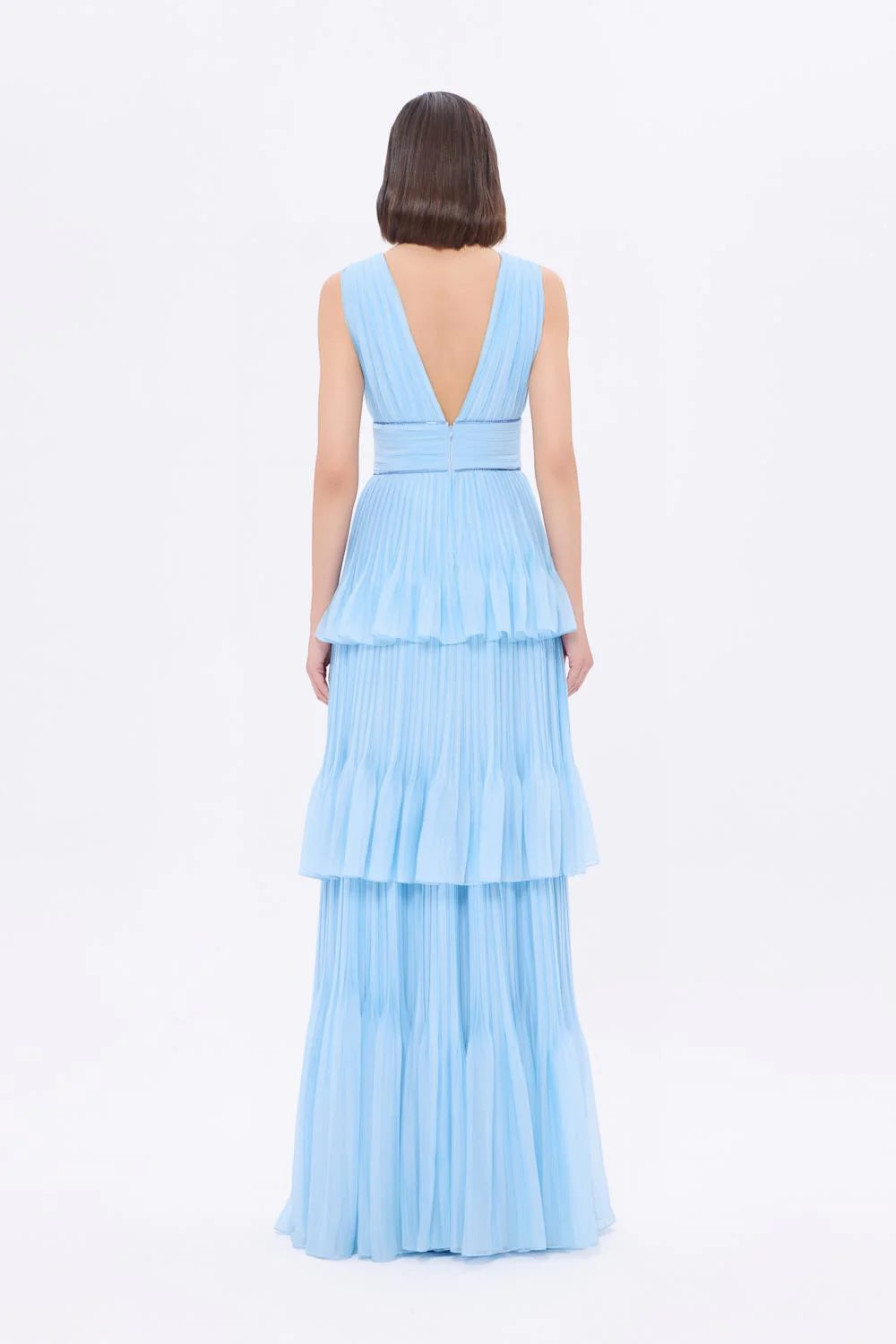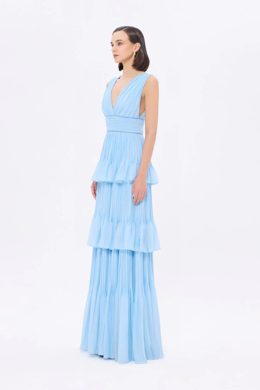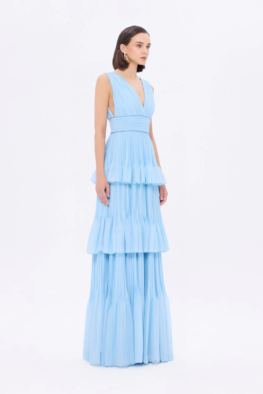 V YAKA VOLANLI ŞİFON UZUN ABİYE ELBİSE - 9274C