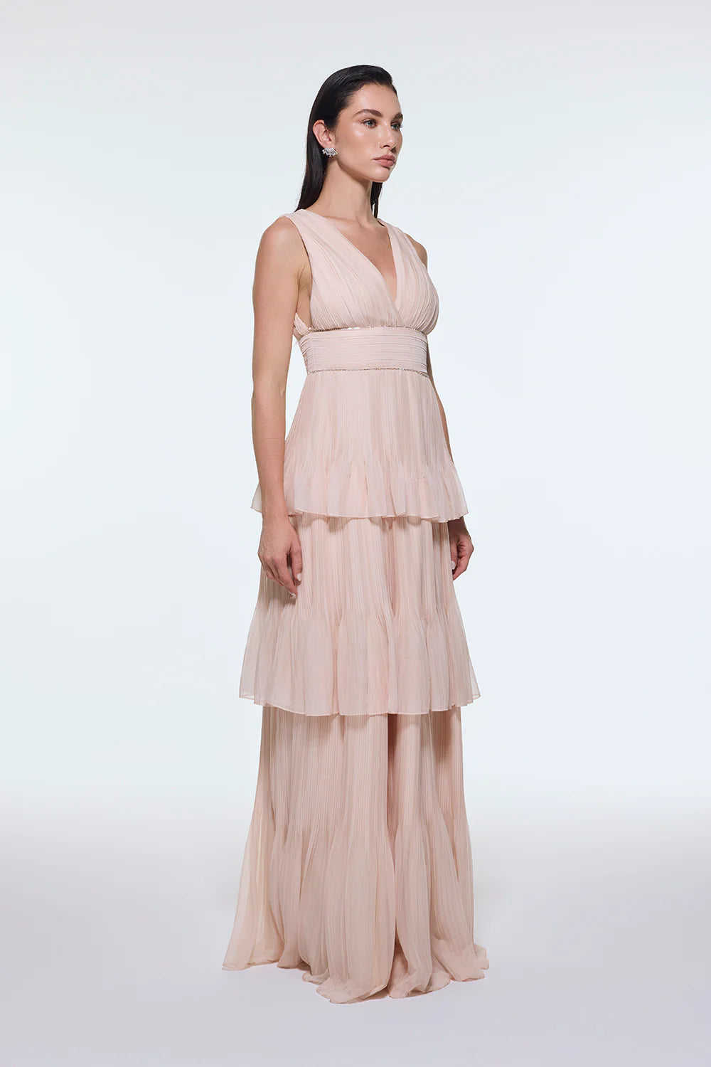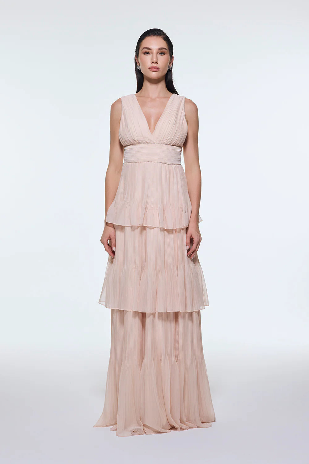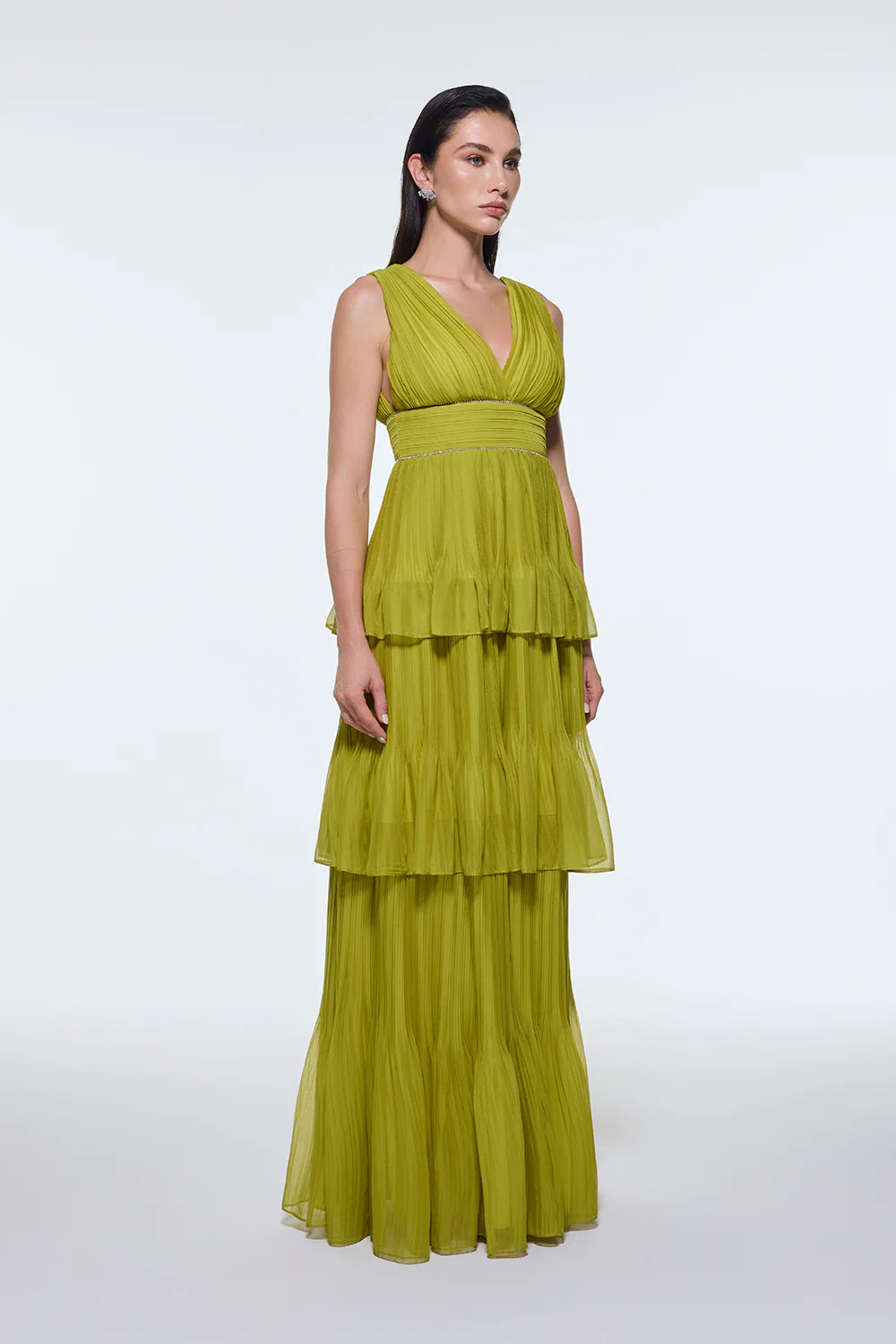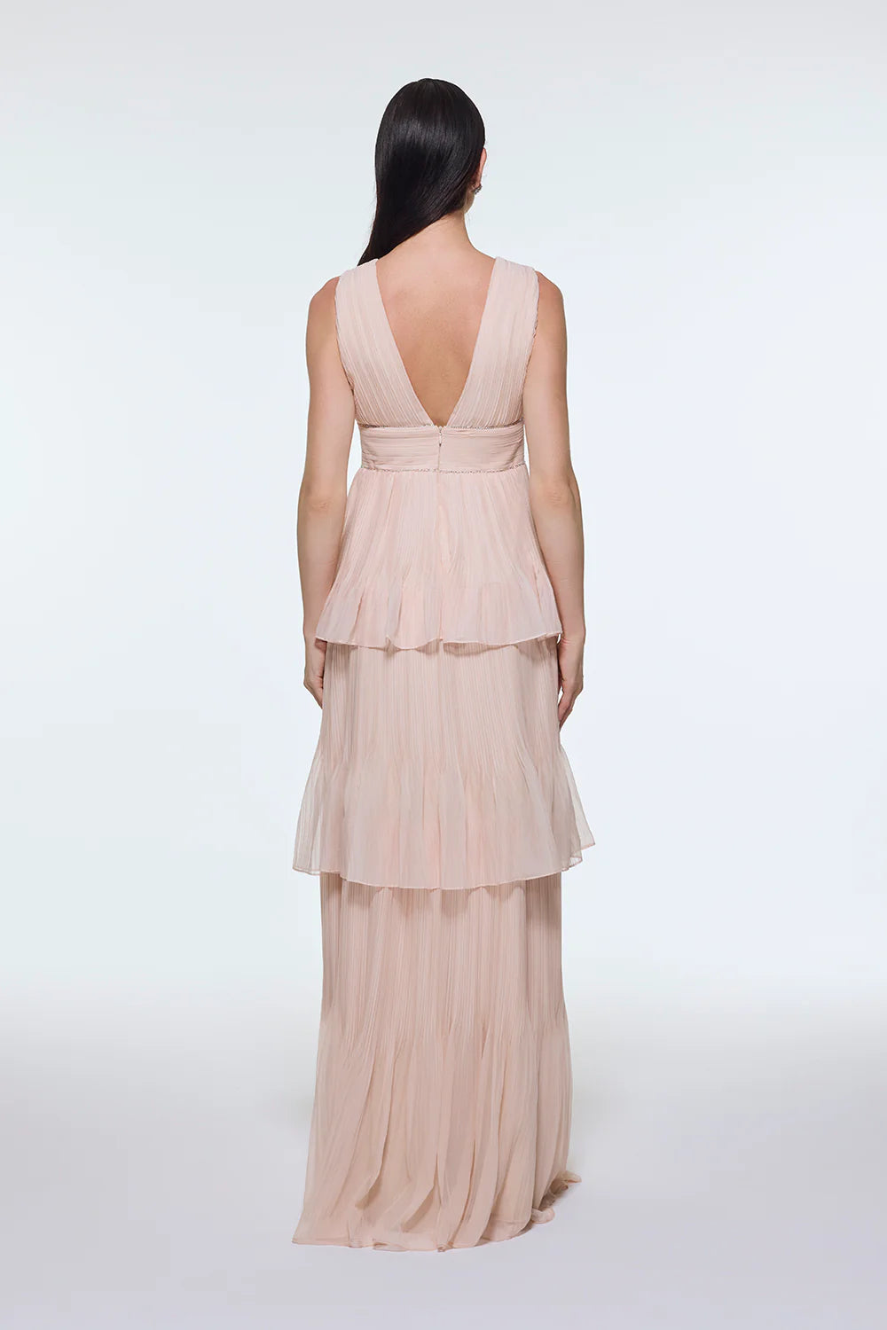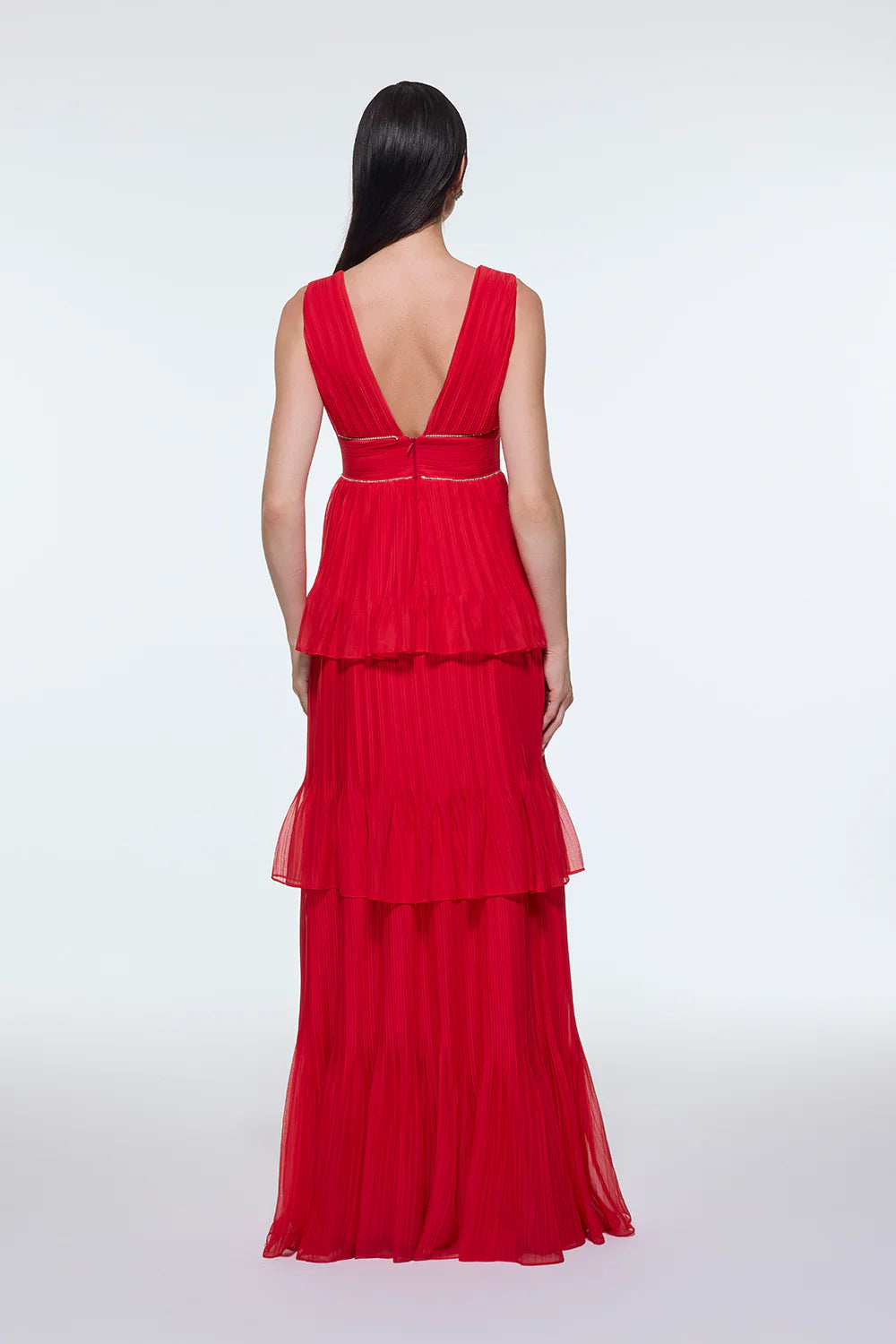 V YAKA VOLANLI ŞİFON UZUN ABİYE ELBİSE - 9274C