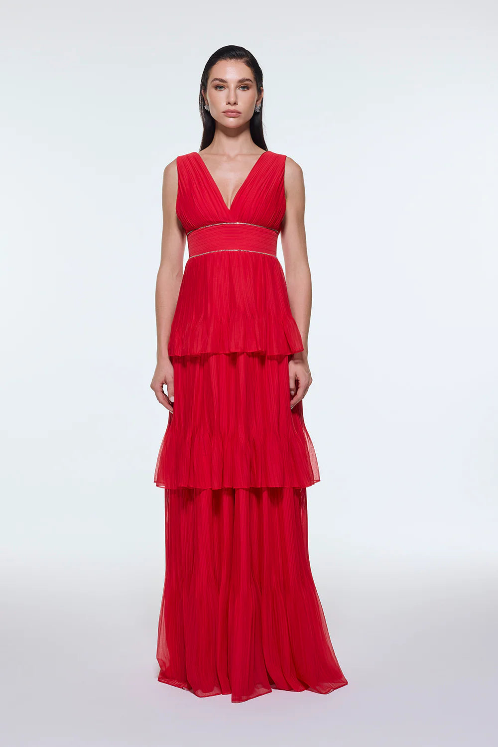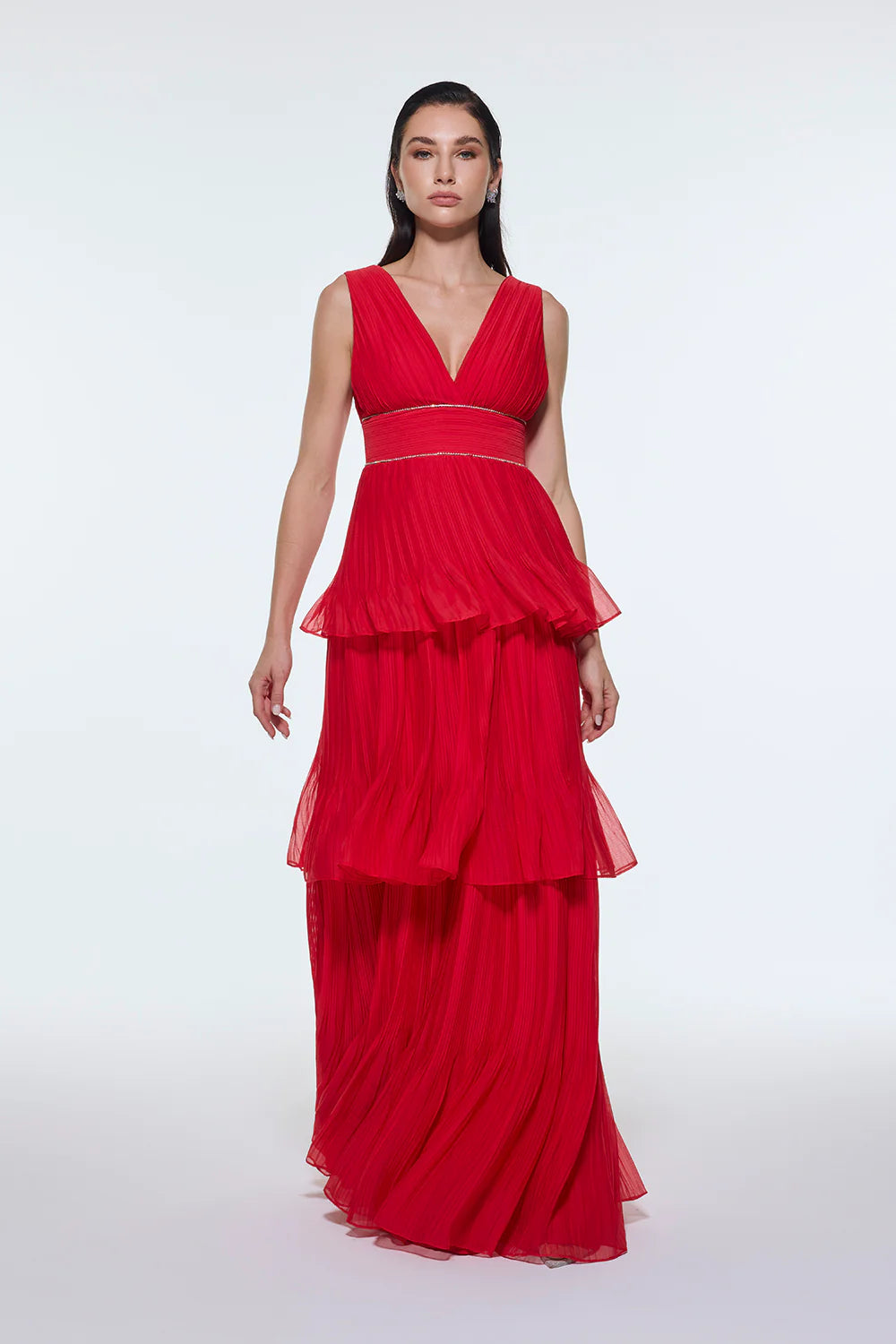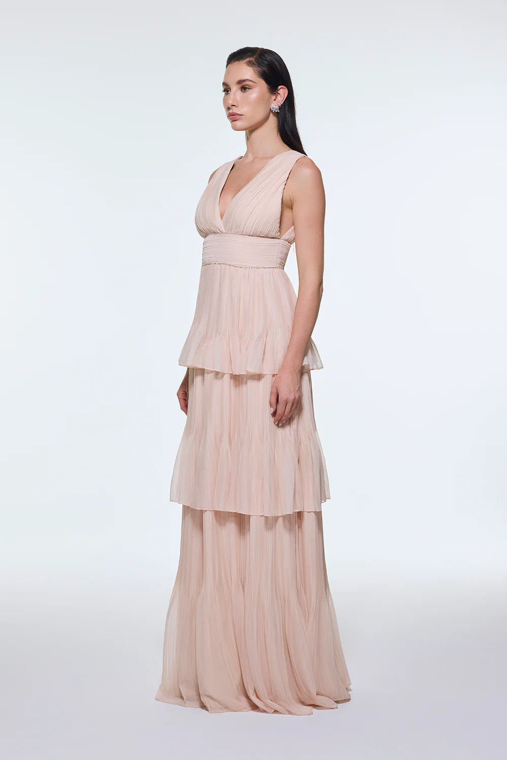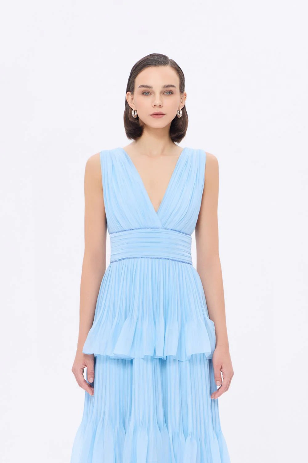 V YAKA VOLANLI ŞİFON UZUN ABİYE ELBİSE - 9274C