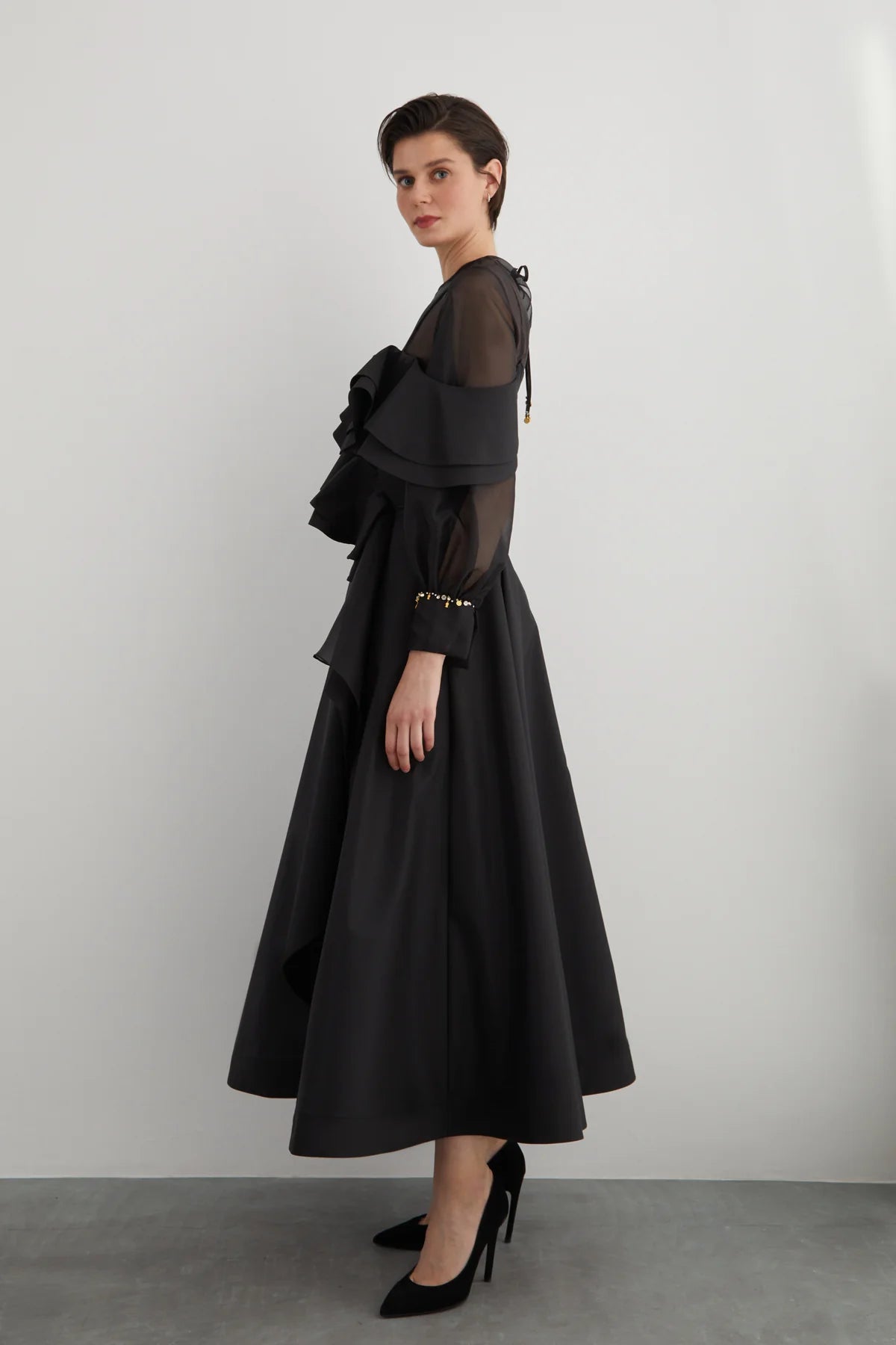 Çıkarılabilir Transparan Bluz Detaylı Manşeti İşlemeli Askılı Elbise