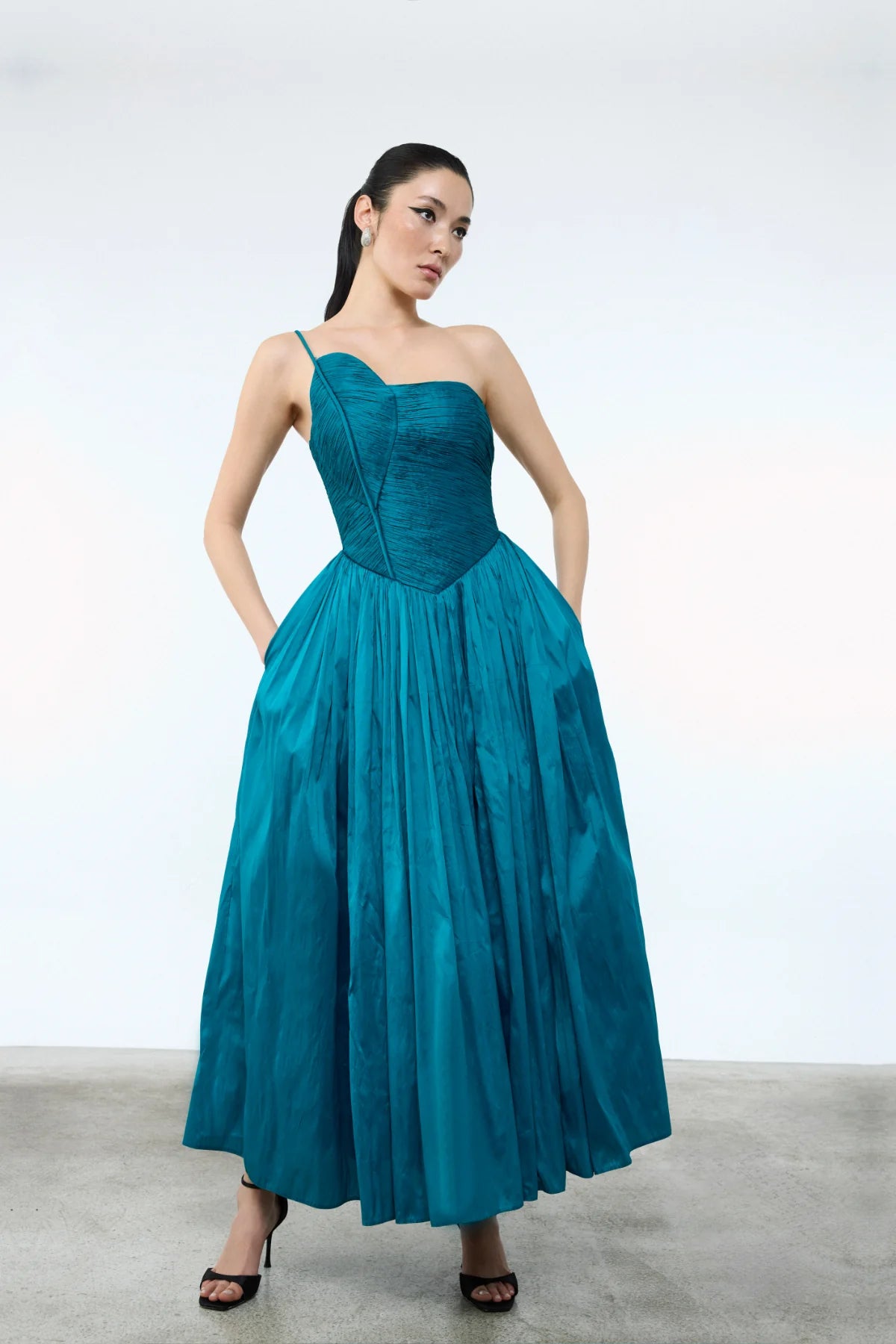 DRAPELİ SATEN TEK ASKILI ABİYE ELBİSE
