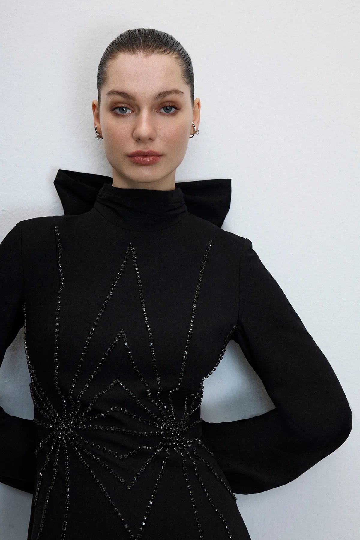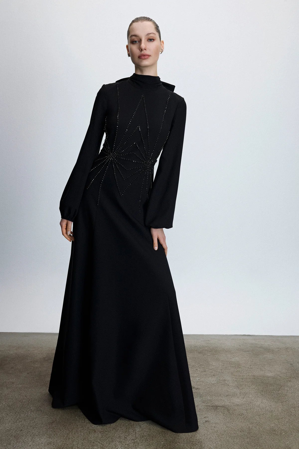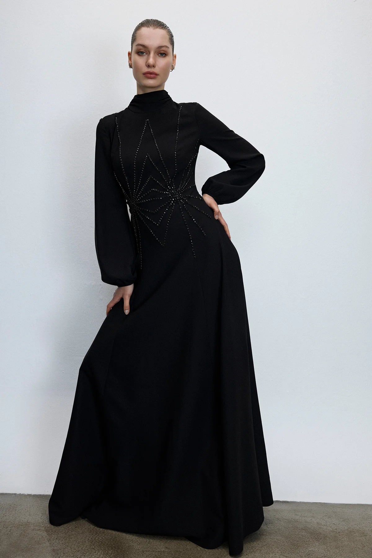 GEOMETRİK TAŞ İŞLEMELİ YÜKSEK YAKA UZUN ABİYE ELBİSE