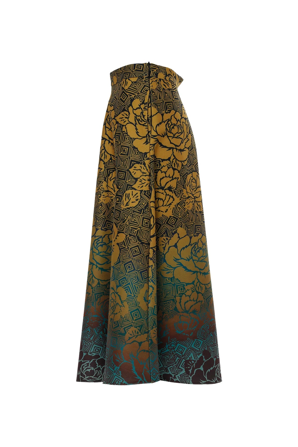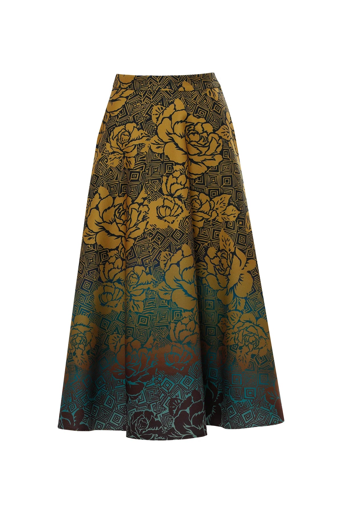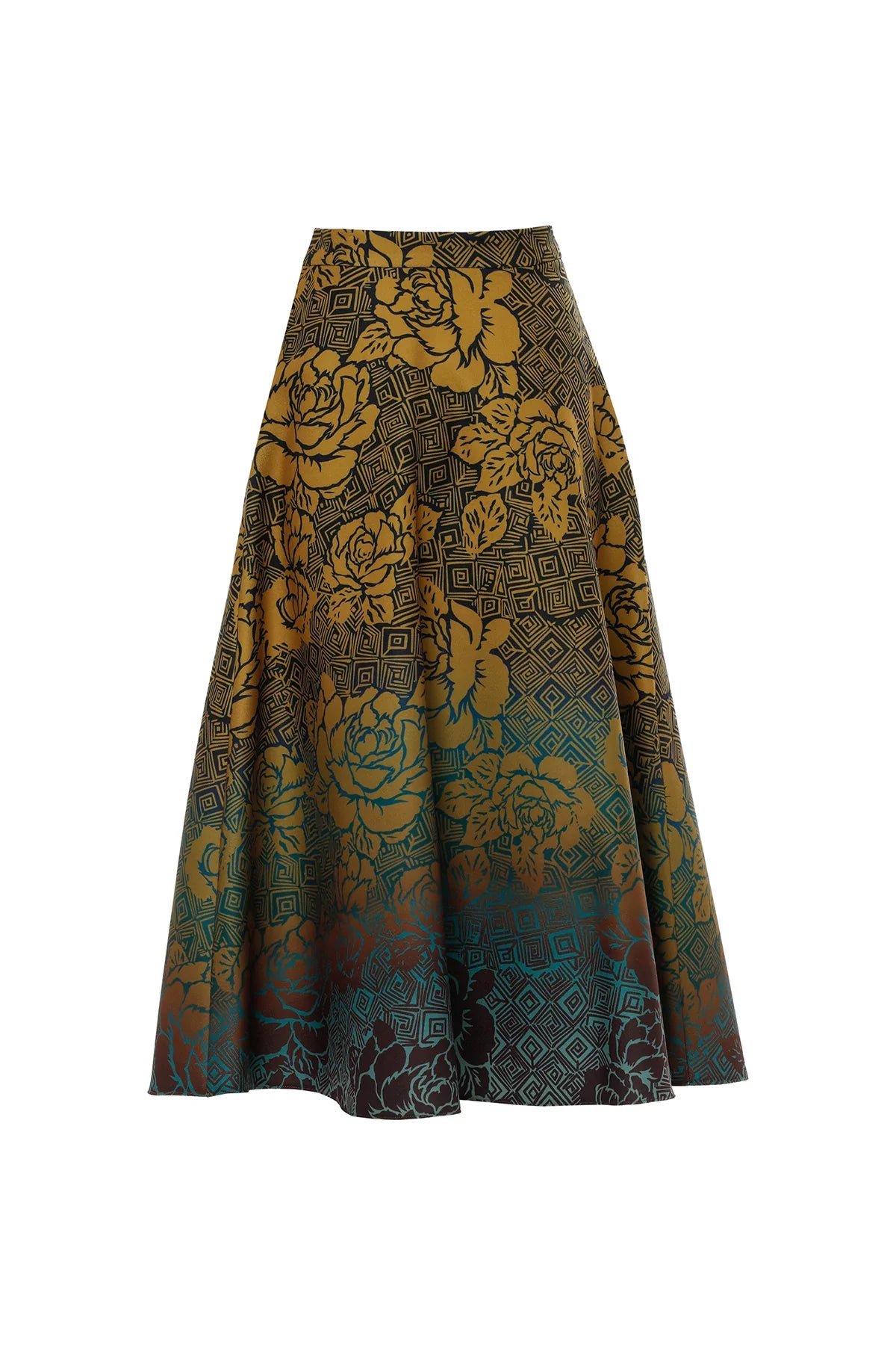 Kontrast Renk Geçişli Gül Desenli A Kesim Midi Boy Kaşe Safran Etek