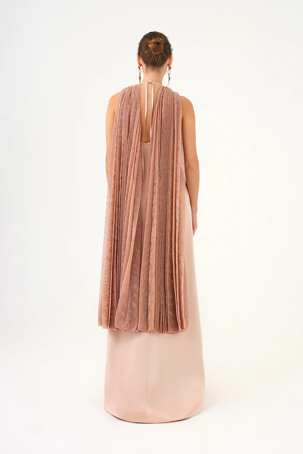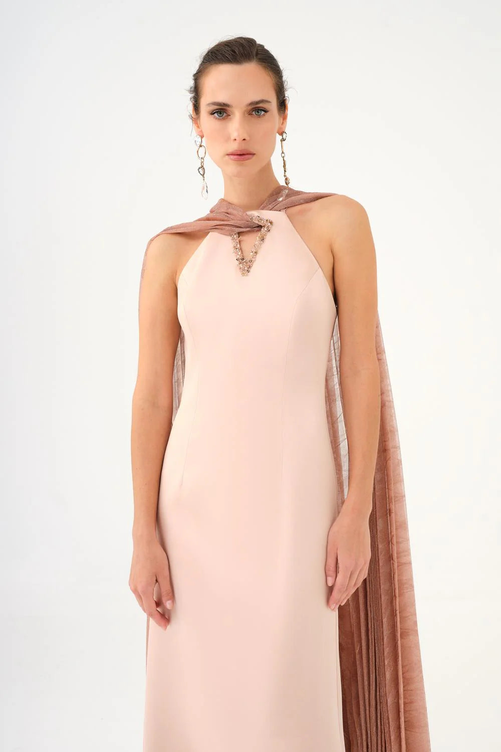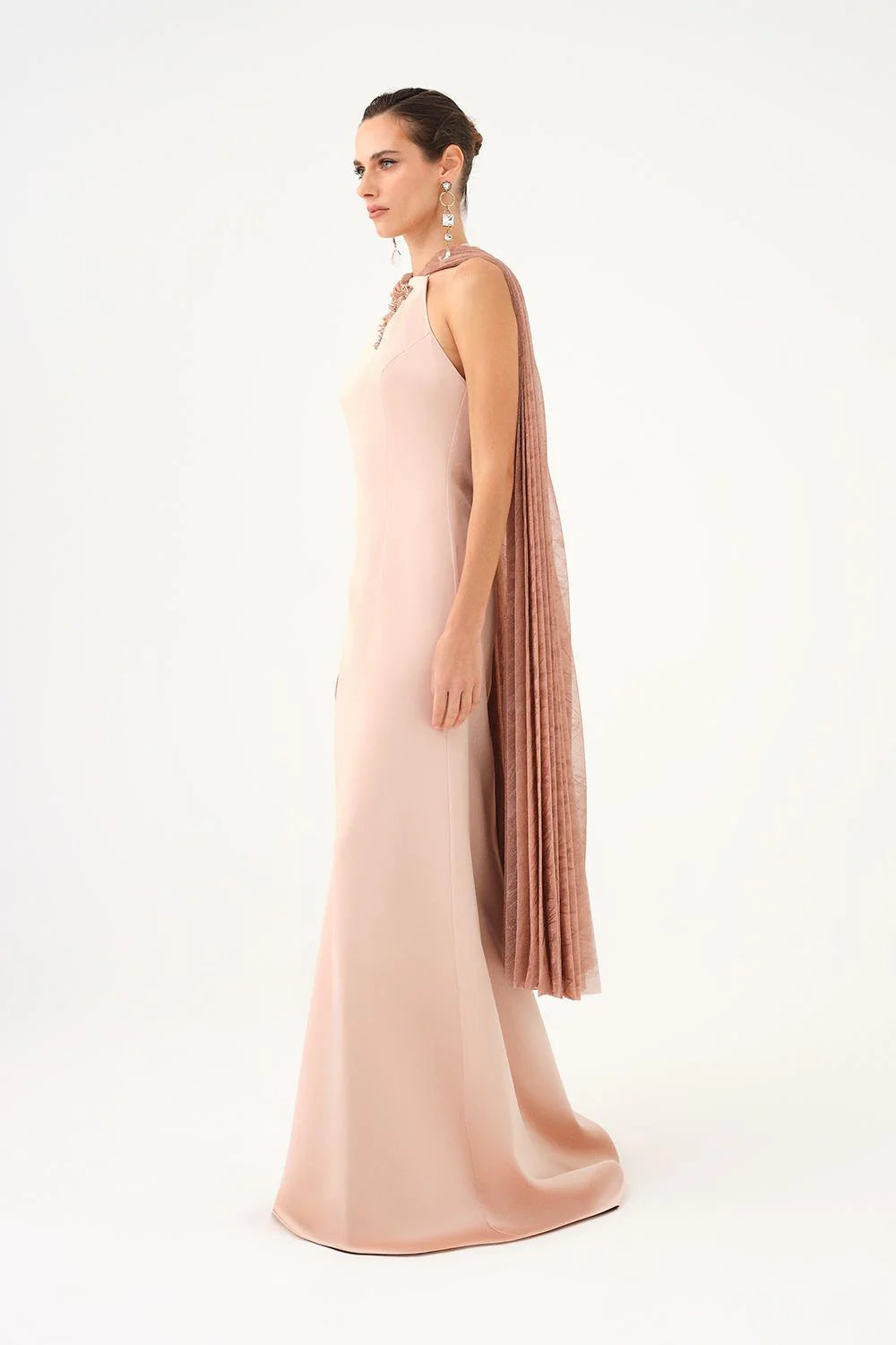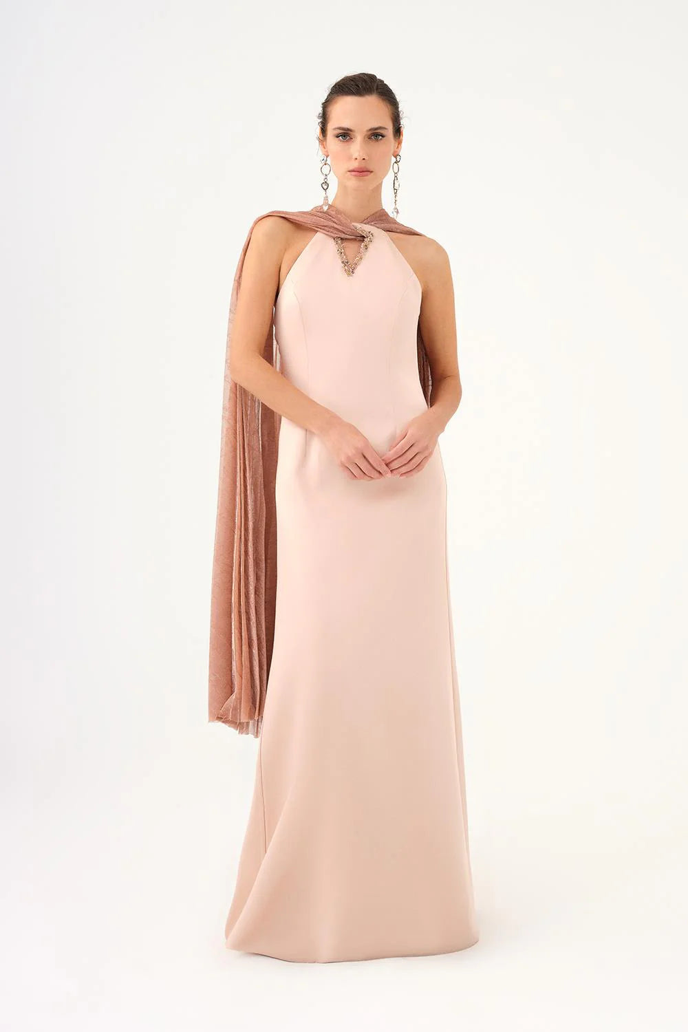 ŞALLI TAŞ İŞLEMELİ SATEN UZUN ABİYE ELBİSE - 9052C