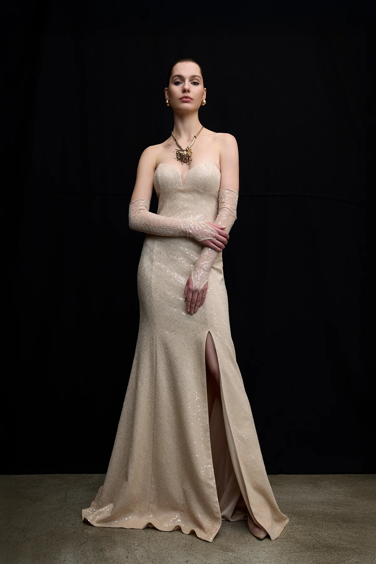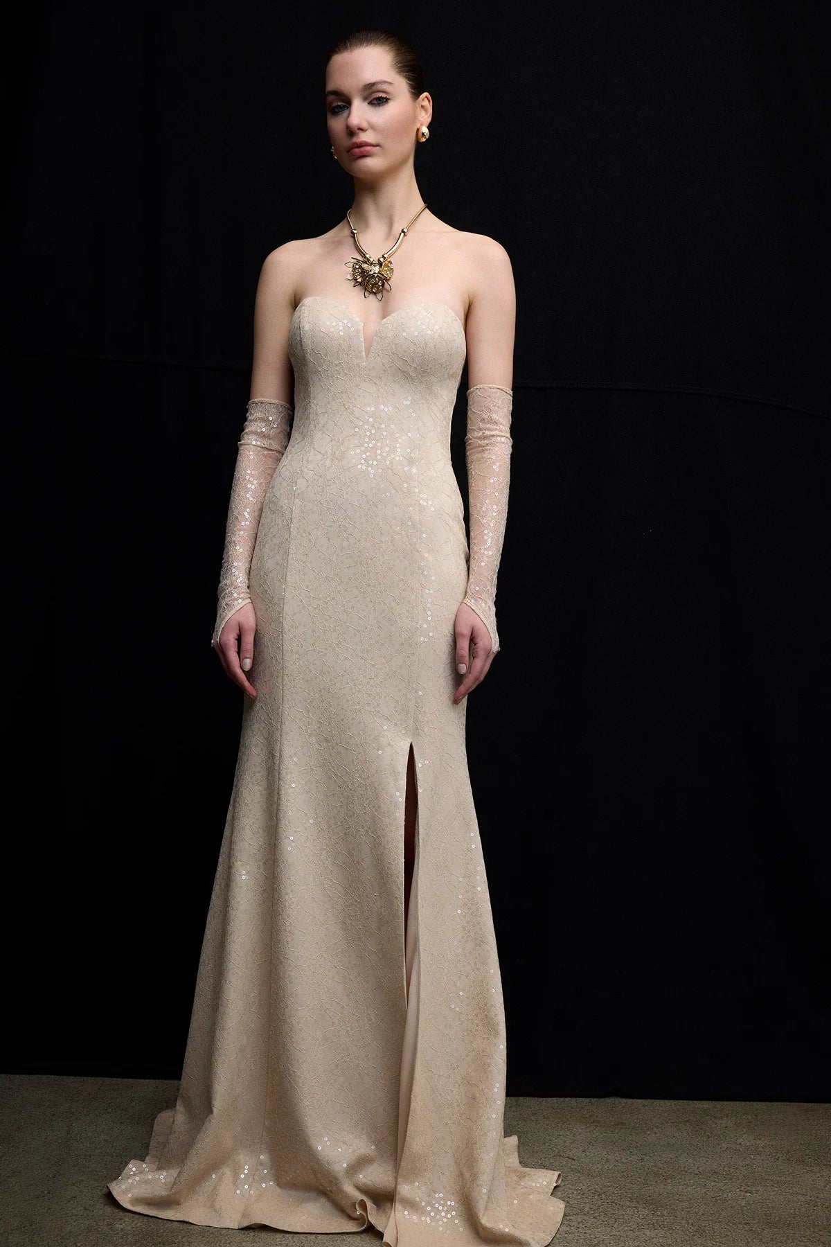 SİMLİ DANTEL KALP YAKA YIRTMAÇ DETAYLI UZUN ABİYE ELBİSE