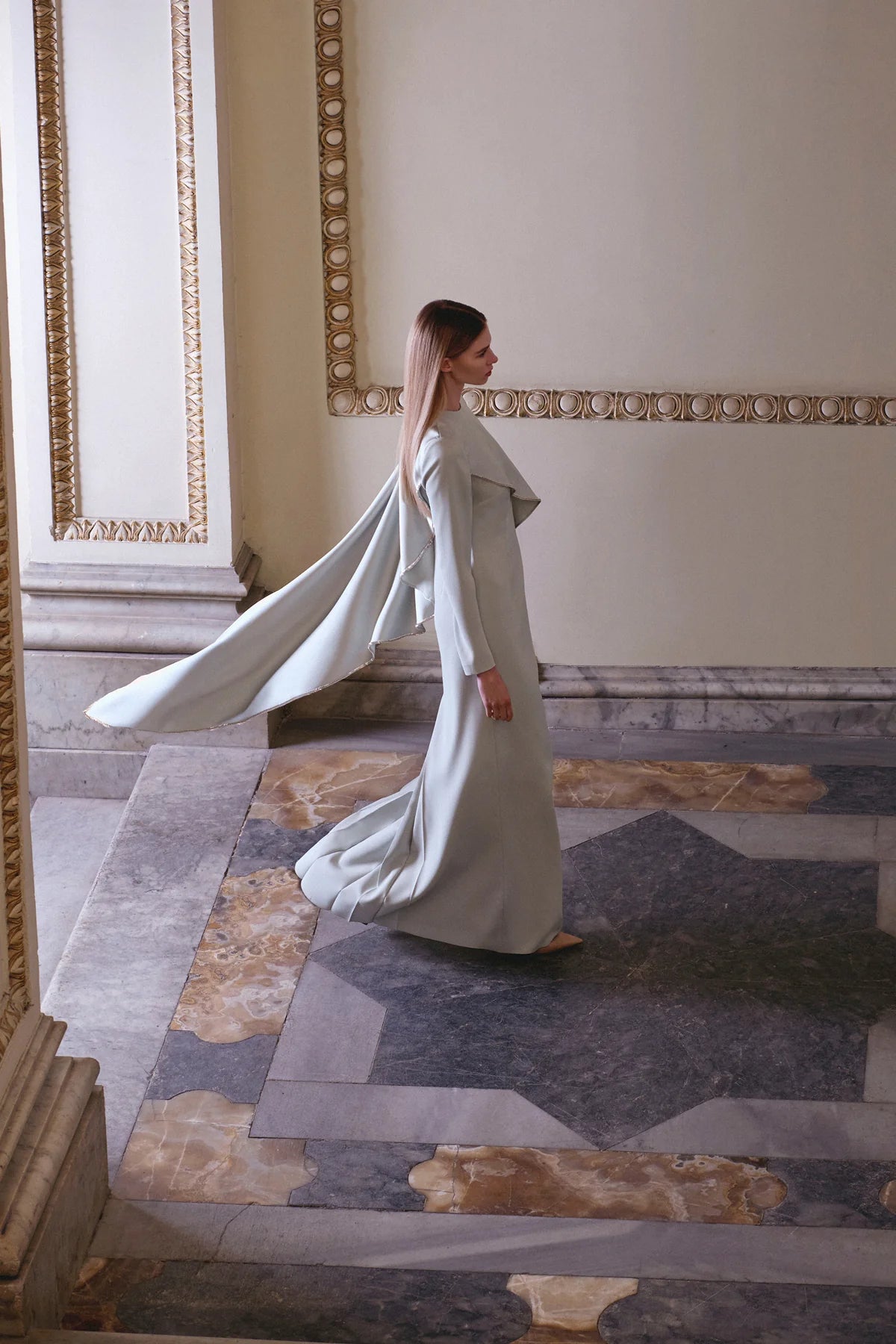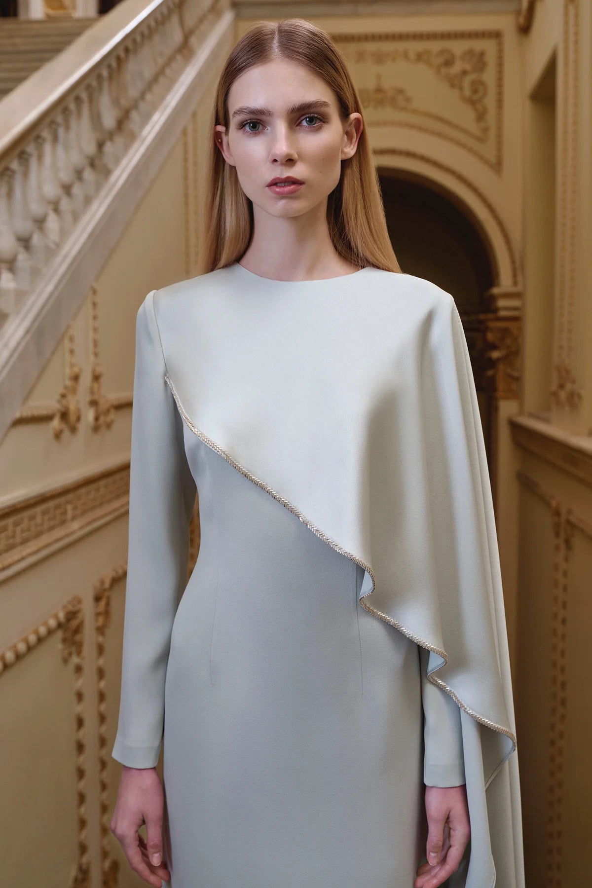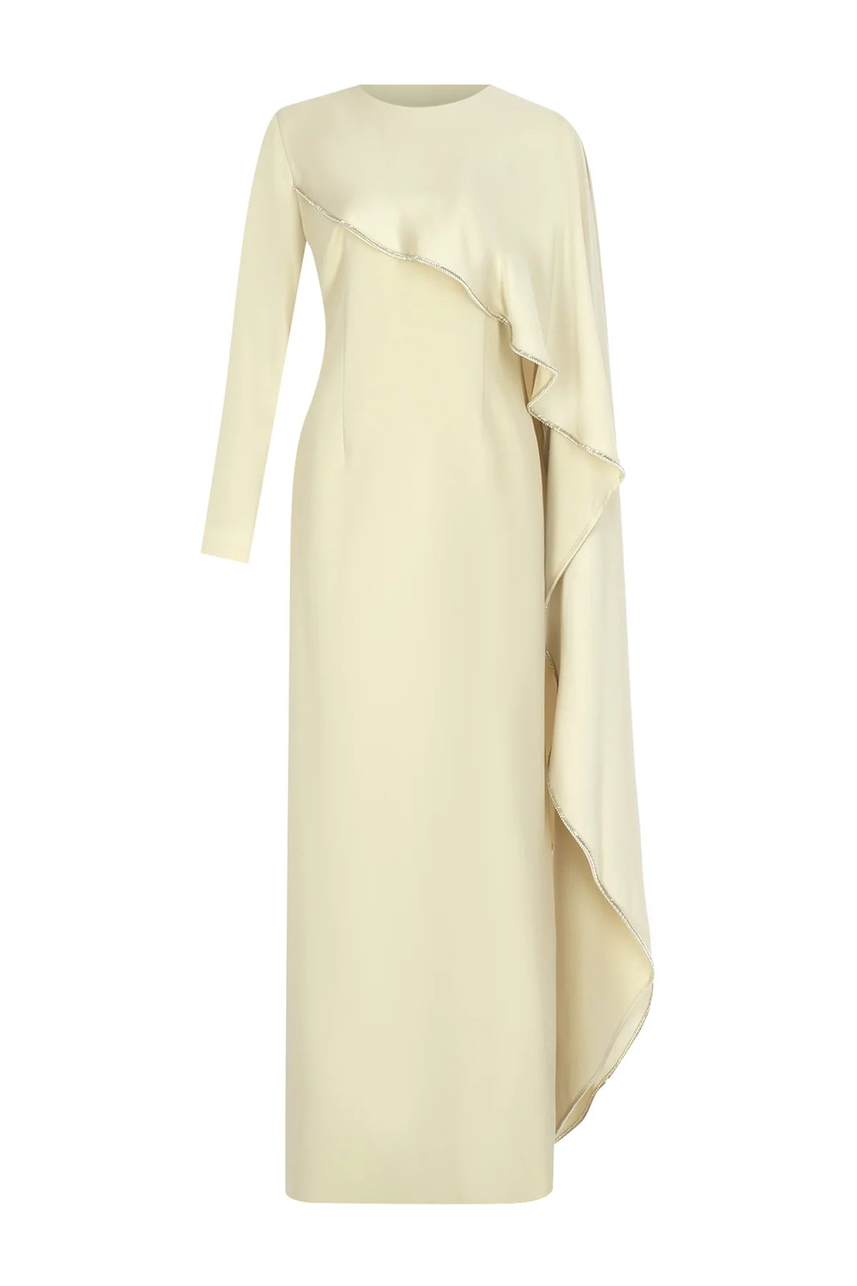 Taş Detaylı Drapeli Asimetrik Uzun Kollu Abiye Elbise 2270