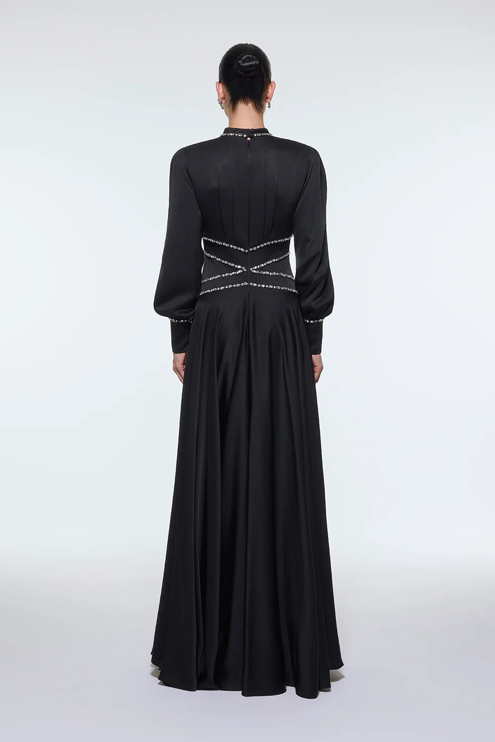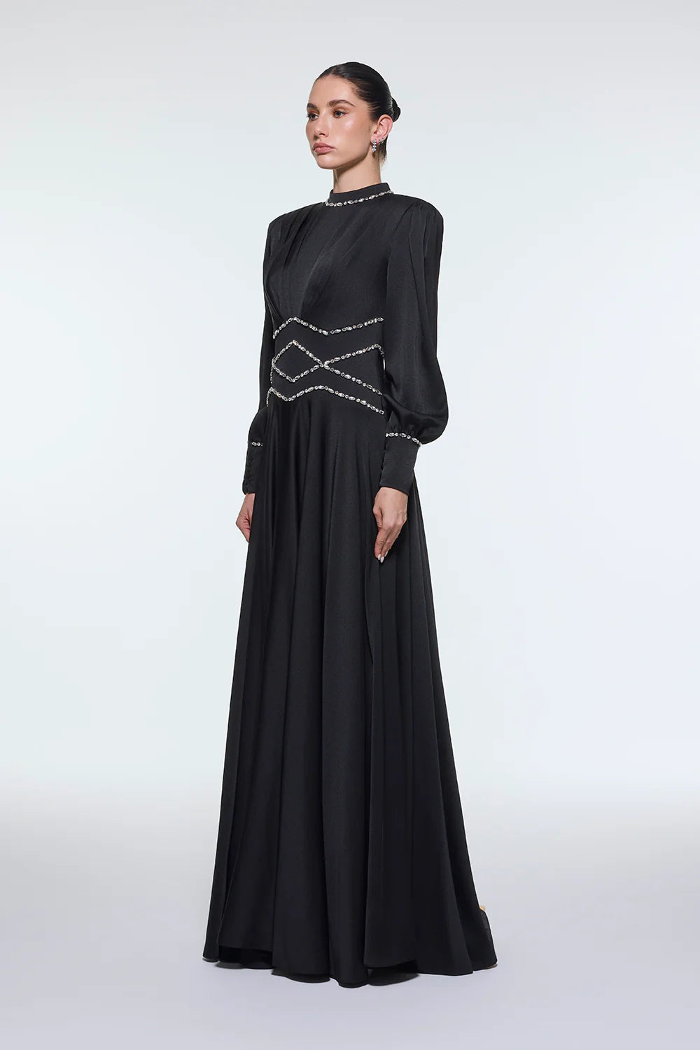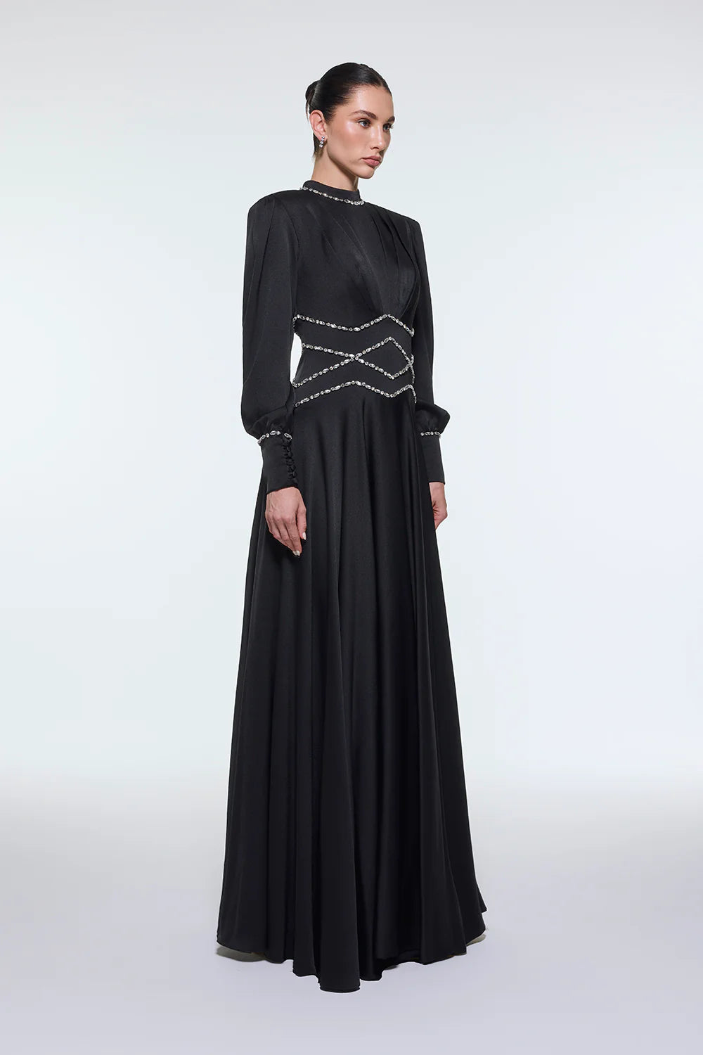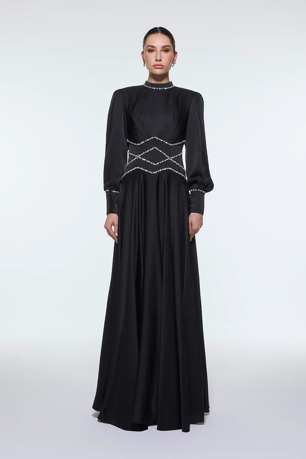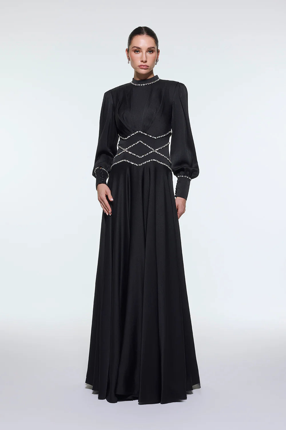 TAŞ İŞLEMELİ DİK YAKA SATEN UZUN ABİYE ELBİSE - 9219C