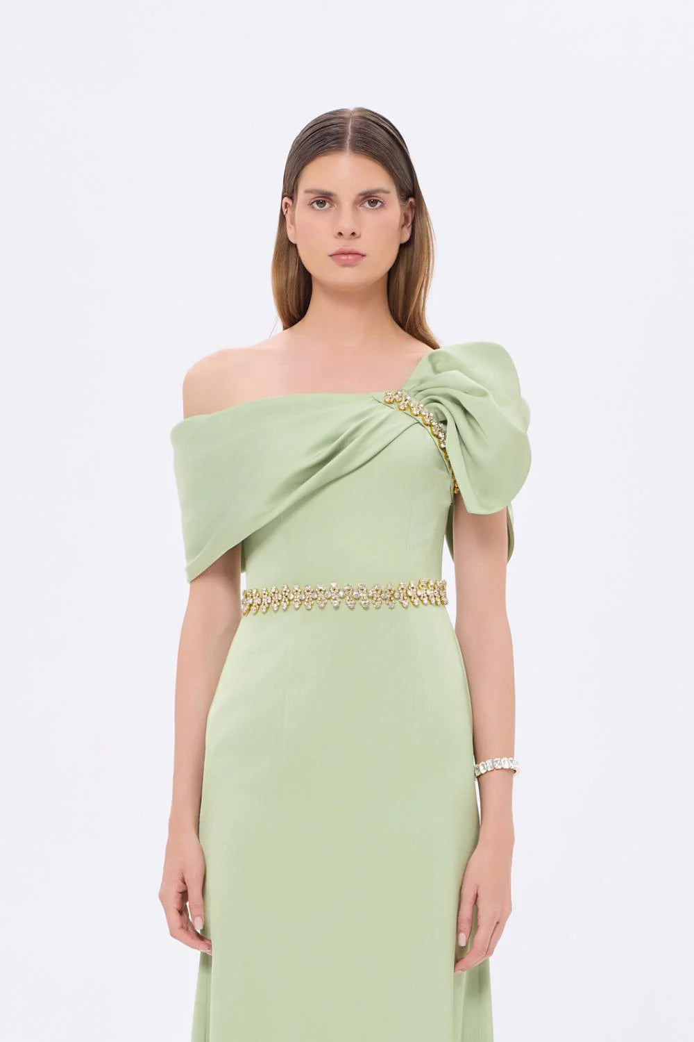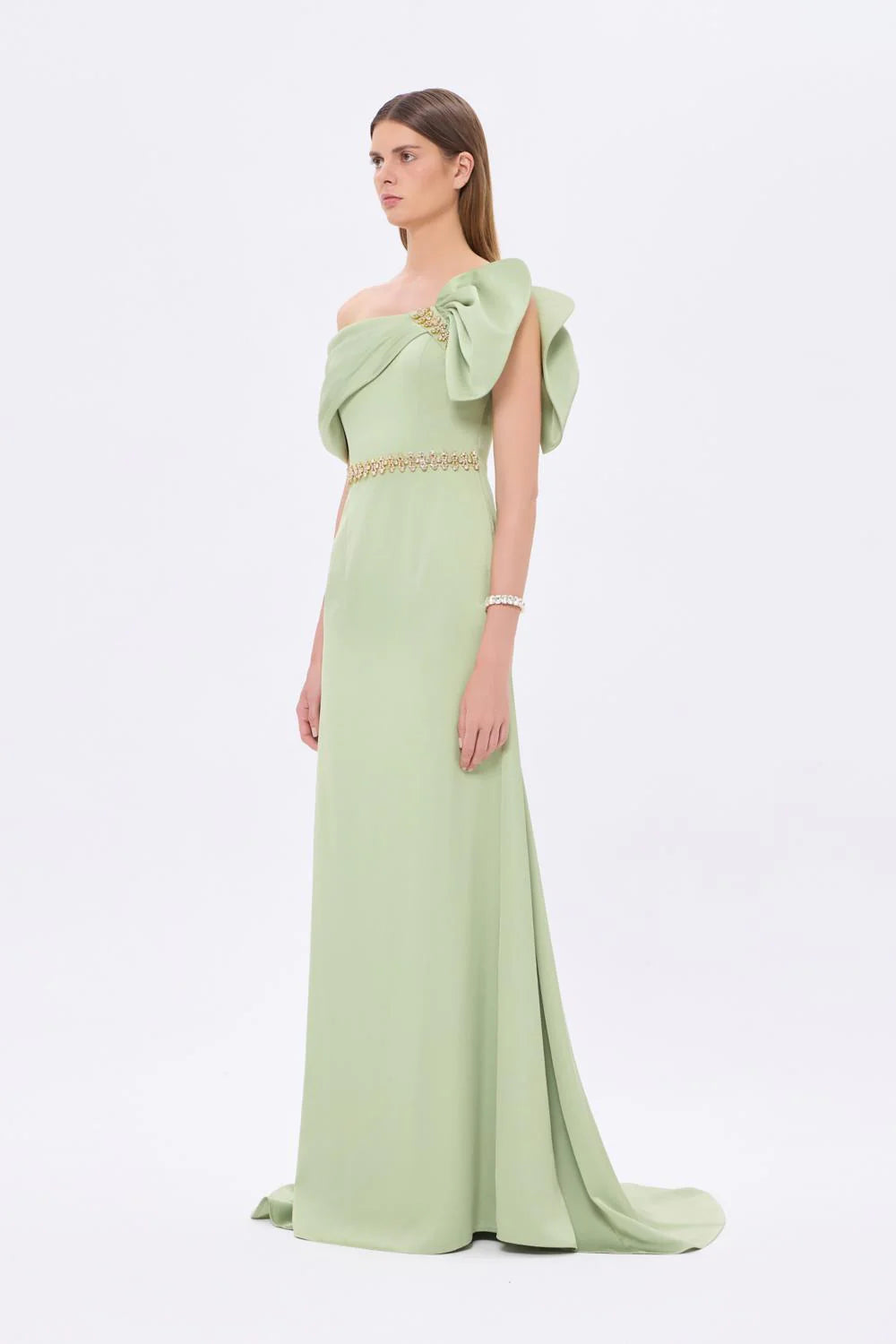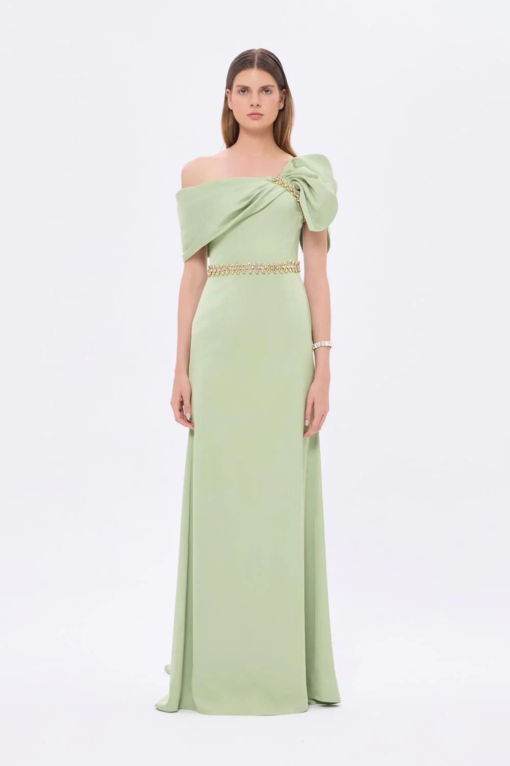 TAŞ İŞLEMELİ KEMER DETAYLI UZUN ABİYE ELBİSE - 9294C