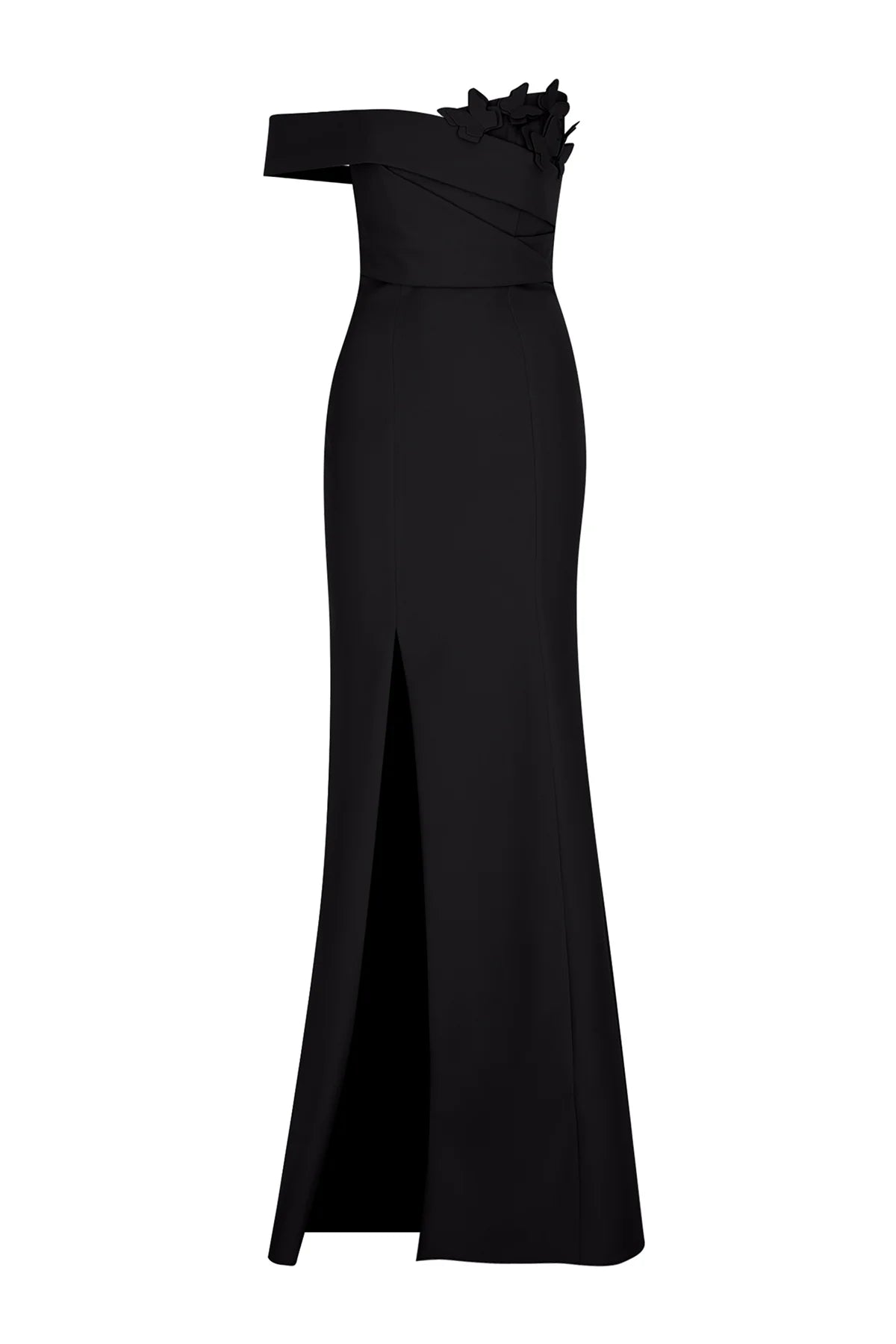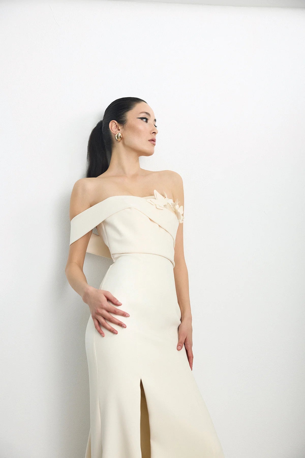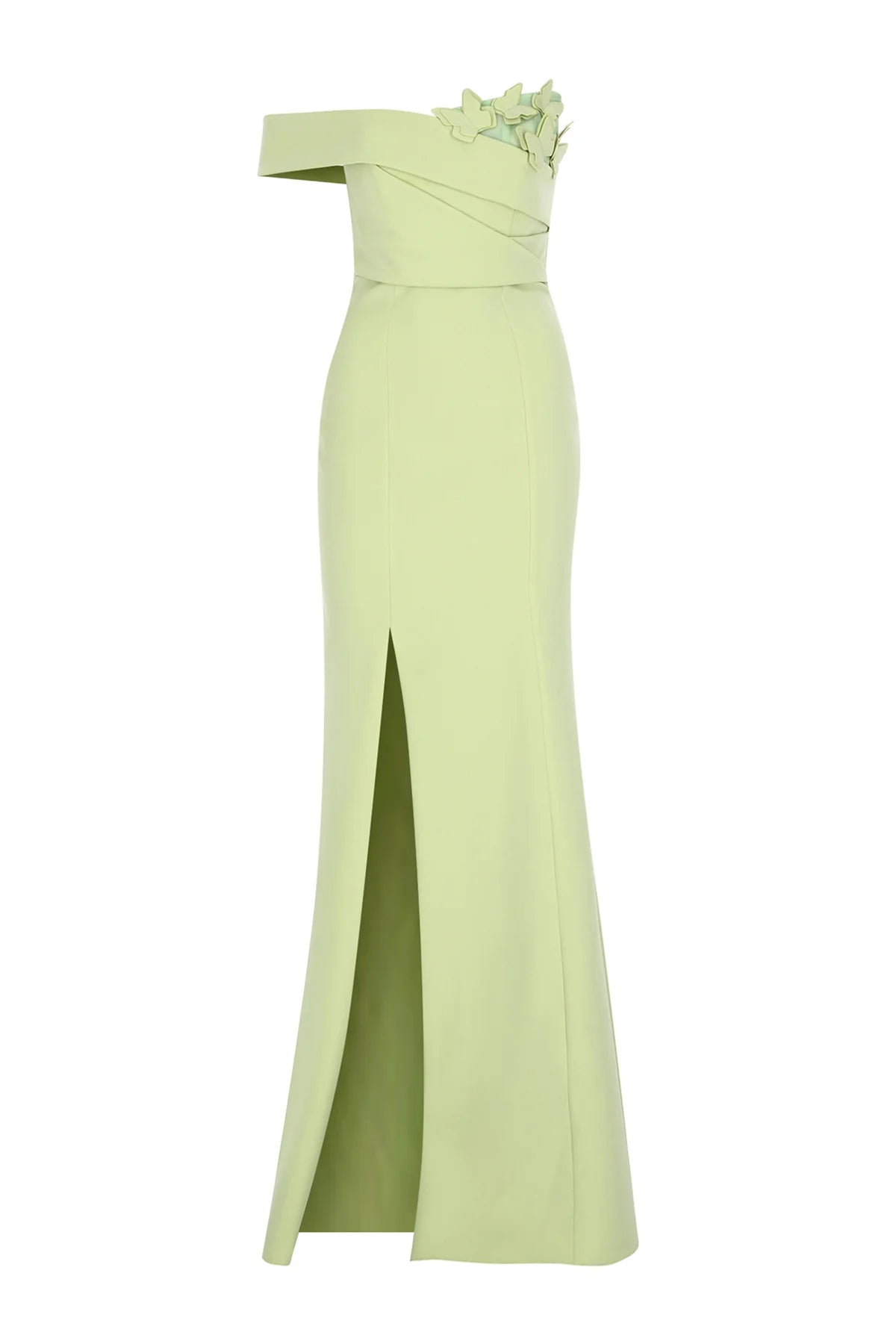 TEK OMUZ VE YIRTMAÇ DETAYLI KELEBEK APLİKELİ ABİYE ELBİSE 2032