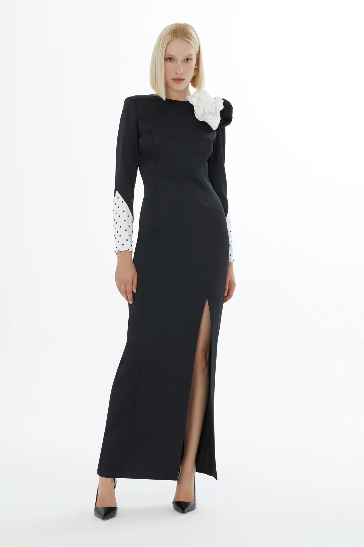 Uzun Kollu Yakada Gül Detaylı Kolları Taşlı Uzun Elbise