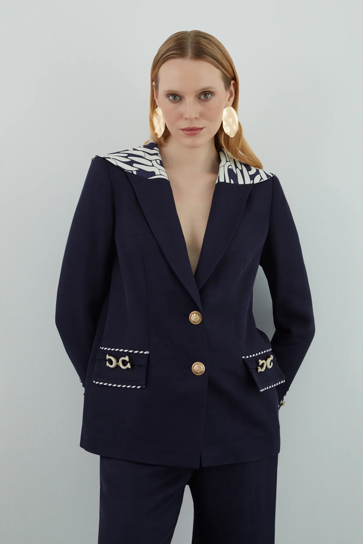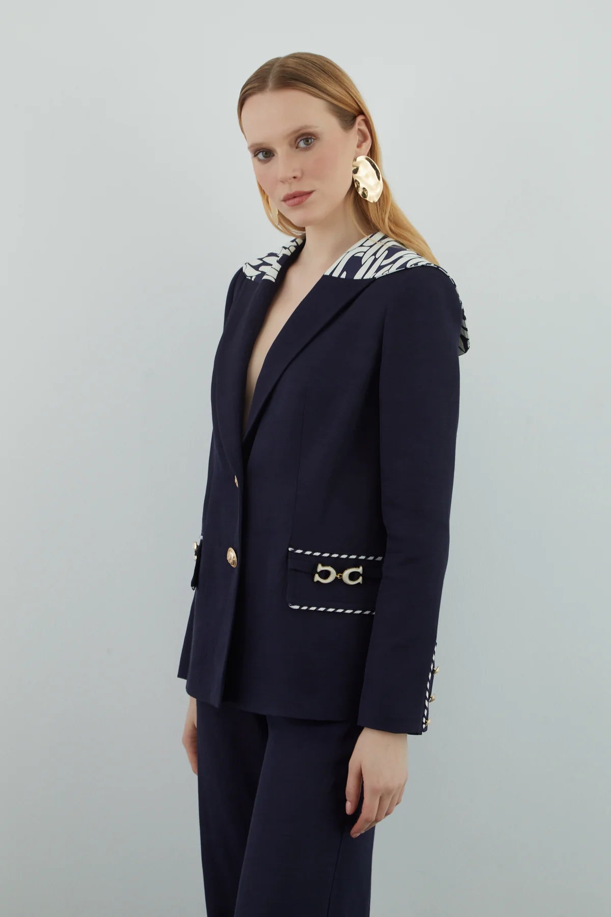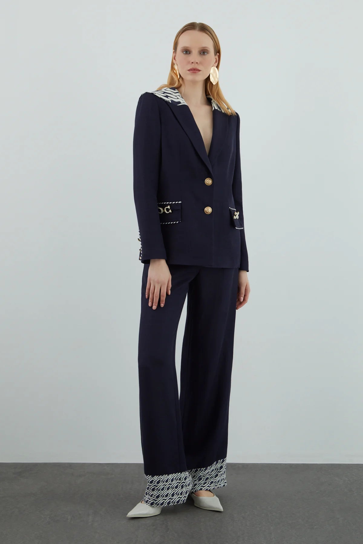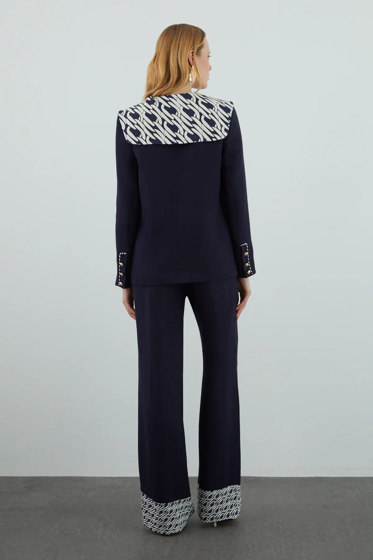 Yakası Desen Detaylı Pantolonlu Takım